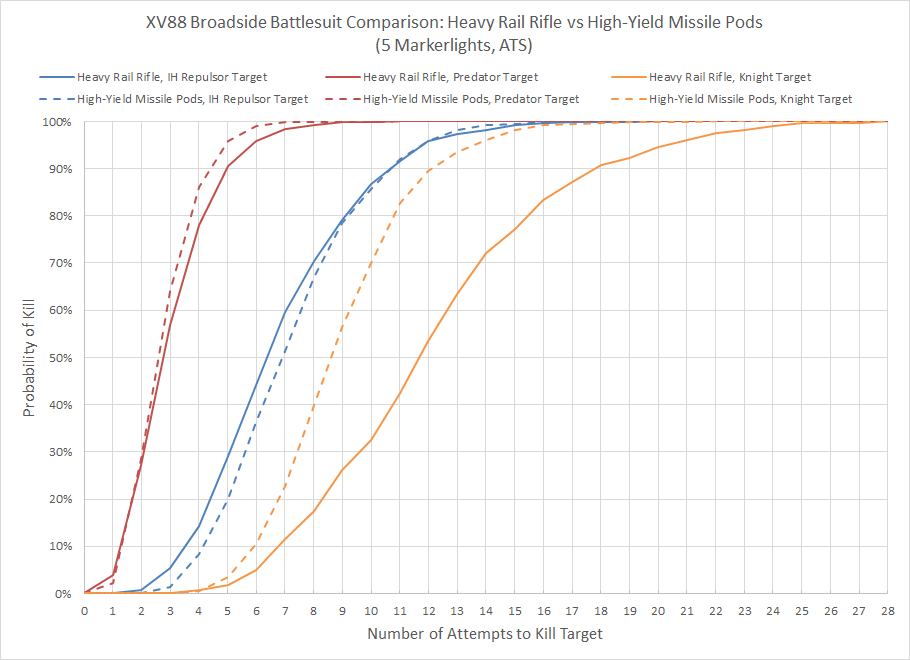 Against the Predator and Knight targets the missile pods are the superior choice, and while the heavy rail rifle did better against the IH Repulsor target the difference was negligible. The extra shots of the high-yield missile pod make it the superior choice against nearly every target, particularly with an ATS added. These numbers confirm the results seen in competitive play, where successful players that use XV88 Broadsides use high-yield missile pods and the ATS option. Missile pods also have the benefit of being vastly more effective against larger units like Primaris Marines.