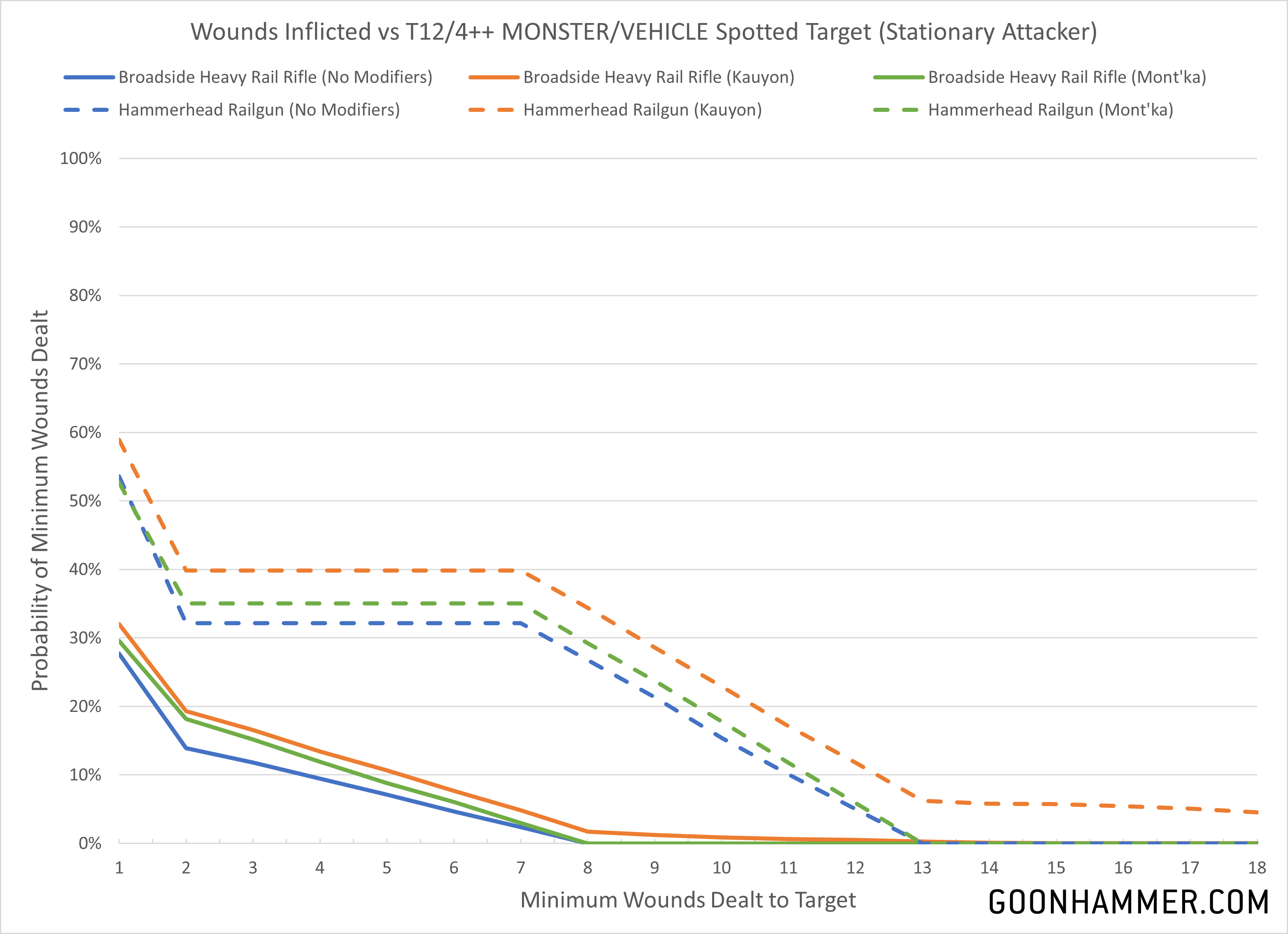 Against a T12 target with a 4+ invulnerable save the answer is "No." Both detachment abilities are superior to the unmodified version, with the extra attacks provided by Kauyon consistently providing an advantage over [LETHAL HITS]. The difference is more pronounced with the Hammerheads, where the high damage output and strength makes the added attacks particularly effective. I also took a look at a T13/5++ target like a Khorne Lord of Skulls and in that case the Broadsides actually averaged more damage under Mont'ka than Kauyon.
