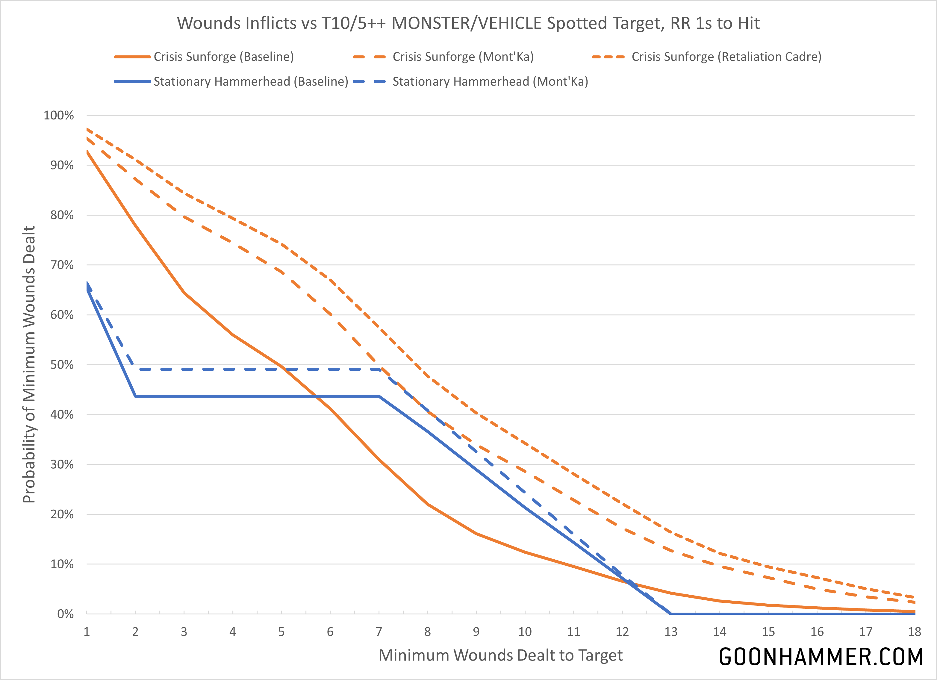 The results are pretty convincing, with the bonuses from the two detachments providing a significant improvement over the unmodified baseline. Retaliation Cadre is particularly useful given the prevalence of T10 targets in the wild but is less useful against tougher targets. Compared to a Hammerhead, the Sunforge is consistently more effective, with even the baseline profile producing a slightly higher average number of wounds.