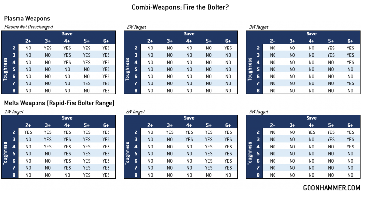 I wonder if there's a discussion anywhere of when to shoot both combi-plasma and bolt profiles? is there any reason to shoot the bolter ever? Against T3 1W horde units likely, but T4 1W? is it cut and dry? Does combi-plasma vs combi-melta affect this math?