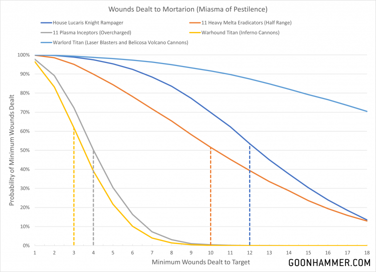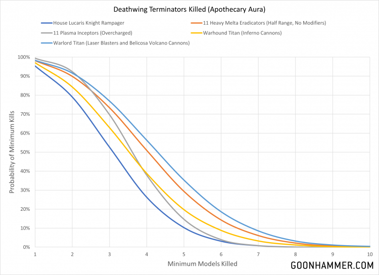 For purposes of determining durability we'll examine the amount of damage dealt to each target in a single turn. For Mortarion we'll look at the number of wounds dealt, while for the Deathwing we'll look at the number of models killed. Our threats will be a House Lucaris Knight Rampager, roughly 500 points worth of Eradicators, roughly 500 points worth of Plasma Inceptors, and on the top end a couple of Titans because I'm convinced that Forge World screwed up.