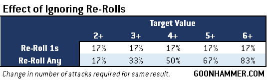 Both Adepta Sororitas and Salamanders received a modification to their faction abilities, gaining the ability to deny units the ability to re-roll wound rolls against them. This was done because Armour of Contempt made their original abilities superfluous. The impact of this ability depends on the original re-roll. In the case of re-rolling 1s the effect is a flat 17% reduction in effectiveness. Against abilities that allow you to re-roll any value the impact increases as the original probability decreases, going all the way up to an 83% reduction versus a target number of 6+. Against Transhuman Physiology the effect is a 50% decrease in effectiveness assuming the attacker intended to re-roll any value of 3 or less.