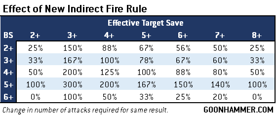 Any weapon that can target units that are not visible to the bearer are considered Indirect Fire weapons, and if no targets are visible to the bearer then the attack reduces the Ballistic Skill characteristic and increases the armour save of the target by 1. ASTRA MILITARUM units are not affected, but things like T'au airburst launchers and Hive Guard impaler cannons are. And because this new rule directly affects the characteristic of the target and firer it stacks with other effects like Dense Cover or Armour of Contempt above.