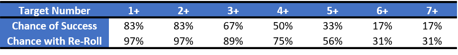 The Throw Team-mate action always contains an element of randomness when the player is thrown. So long as the Passing Ability test does not result in a 1 (modified or not) then the player will scatter from the target square (moving a single square in one of 8 possible directions a total of 3 times). A "superb" throw occurs when the Passing Ability test is successful, while a "successful" throw is one where the Passing Ability test is failed but the result is not a 1. The chart below shows the resulting distribution of the impact, where hitting the target square only occurs 4.7% of the time and you only have a 47.1% chance of landing within one square of the target. Should the result of the Passing Ability test be a modified 1 (terrible throw) then the thrown player will deviate from the thrown player, meaning they will move D6 squares in a random direction. If the result is a natural 1 (fumbled throw) then the thrown player will simply bounce a single square in a random direction centered on the throwing player. This means that the most important factor in throwing a player isn't the skill of the thrower, but the penalties that increase the risk of rolling a 1.