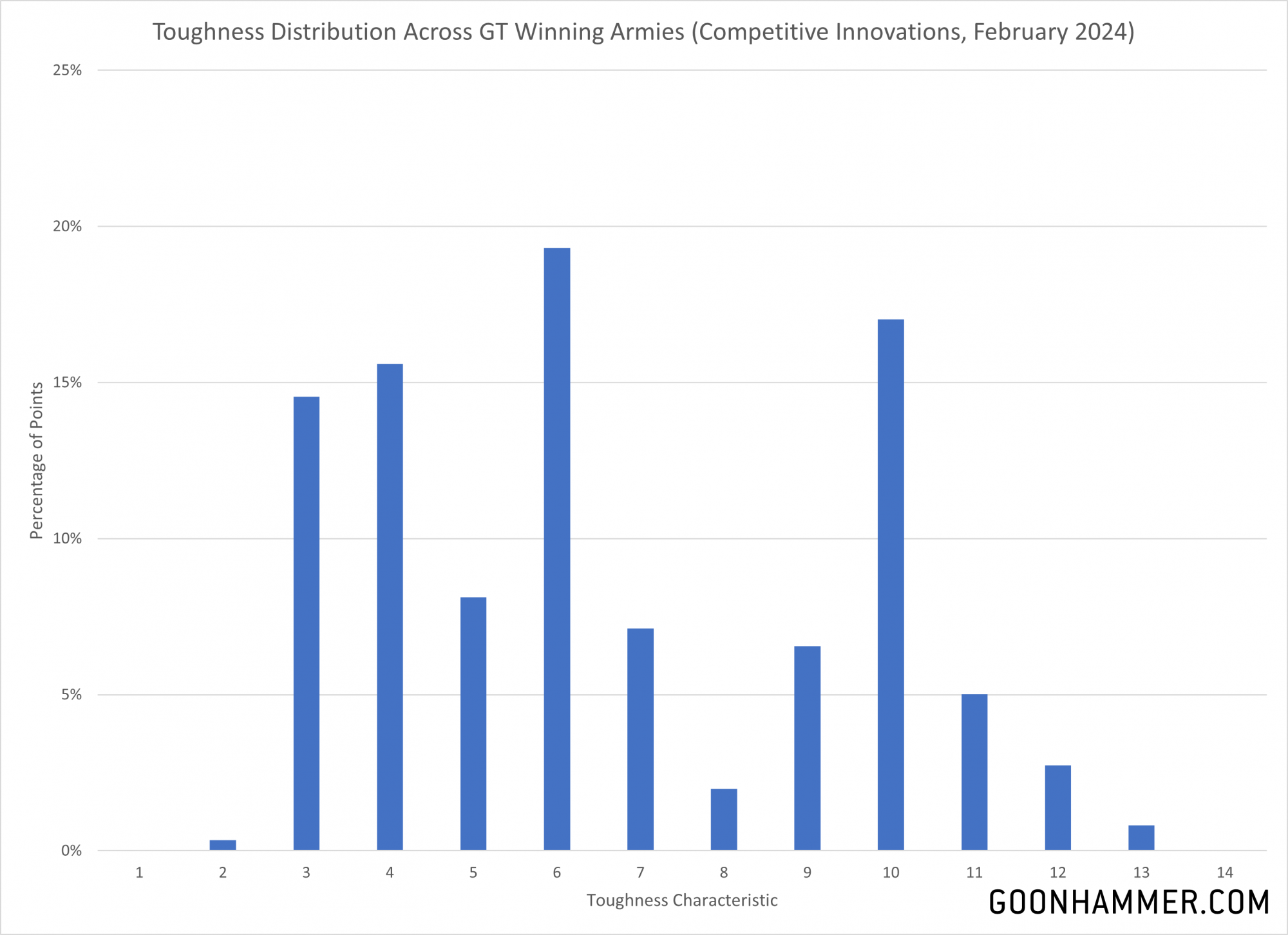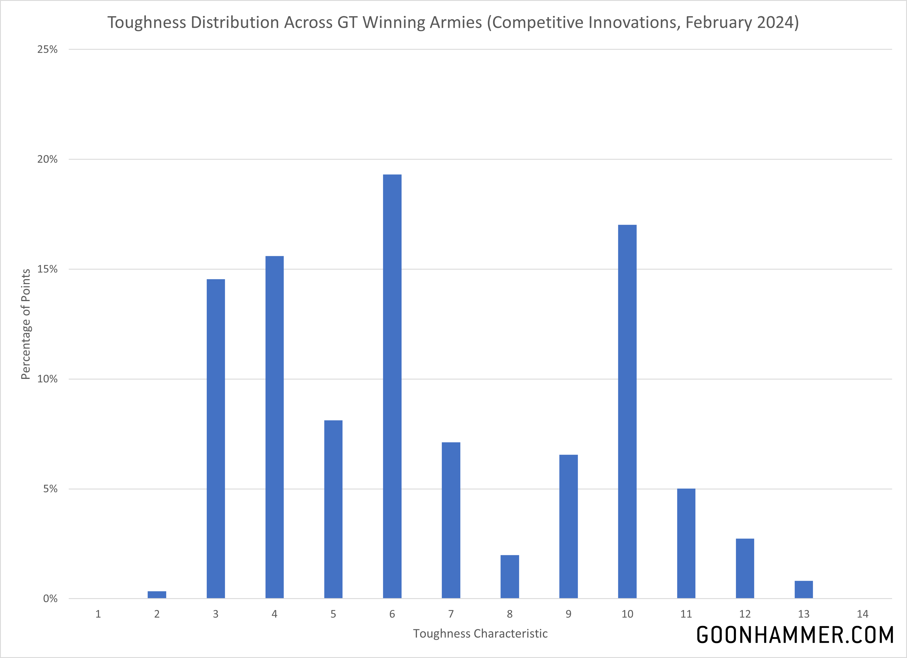 - The four most prevalent Toughness characteristics were 10, 6, 4, and 3, with two thirds of the points spent on units in these lists allocated to those values. T6 was the most popular with 19% of the points allocated.