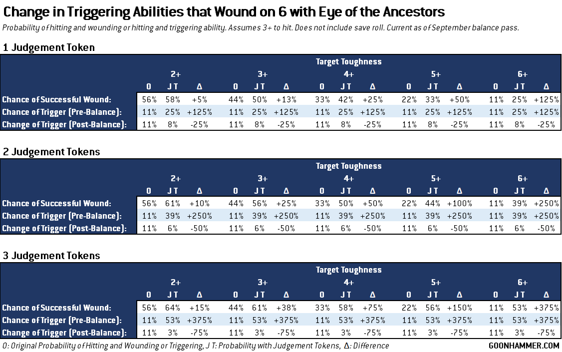 One thing that interested us at Goonhammer was what would happen if the various effects triggered on an unmodified hit roll of 6 instead of an unmodified wound roll of 6. In this case the probability of triggering with at least one Judgement token would be a flat 17%, as the unmodified hit roll of 6 would also guarantee a wound. This is slightly higher than the 11% baseline probability achieved from a 3+ to hit and a 6 to wound, but is significantly less than the chances of triggering before the balance pass. If something like this was implemented then Ancestral Fortune would need to be changed so that it was considered a modified result instead of unmodified. It might be worth doing anyway, since the ability explicitly modifies the result.