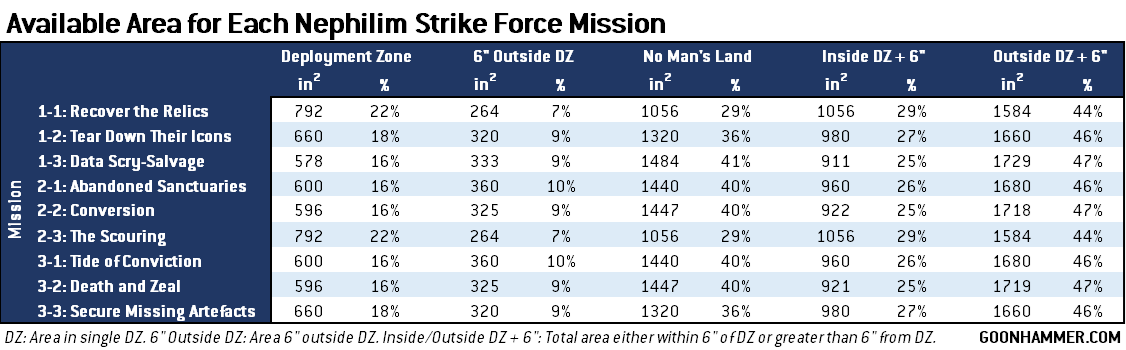 The nine missions for Nephilim share five deployment zone configurations, and 17 secondary objectives incorporate deployment zones (outside the context of objective markers) in some way. 11 of them are about being in one or both zones, 3 have a restriction related to a region within 6" of a deployment zone, 2 explicitly mention No Man's Land, and the Space Wolves have a secondary objective called Warrior Pride which requires you to not be in your own deployment zone. The charts below show the available area for the deployment zone, region 6" outside of a single DZ, and No Man's Land. There's also columns for the total available area for the secondary objectives which either require you to be within 6" of a DZ or at least 6" away.
