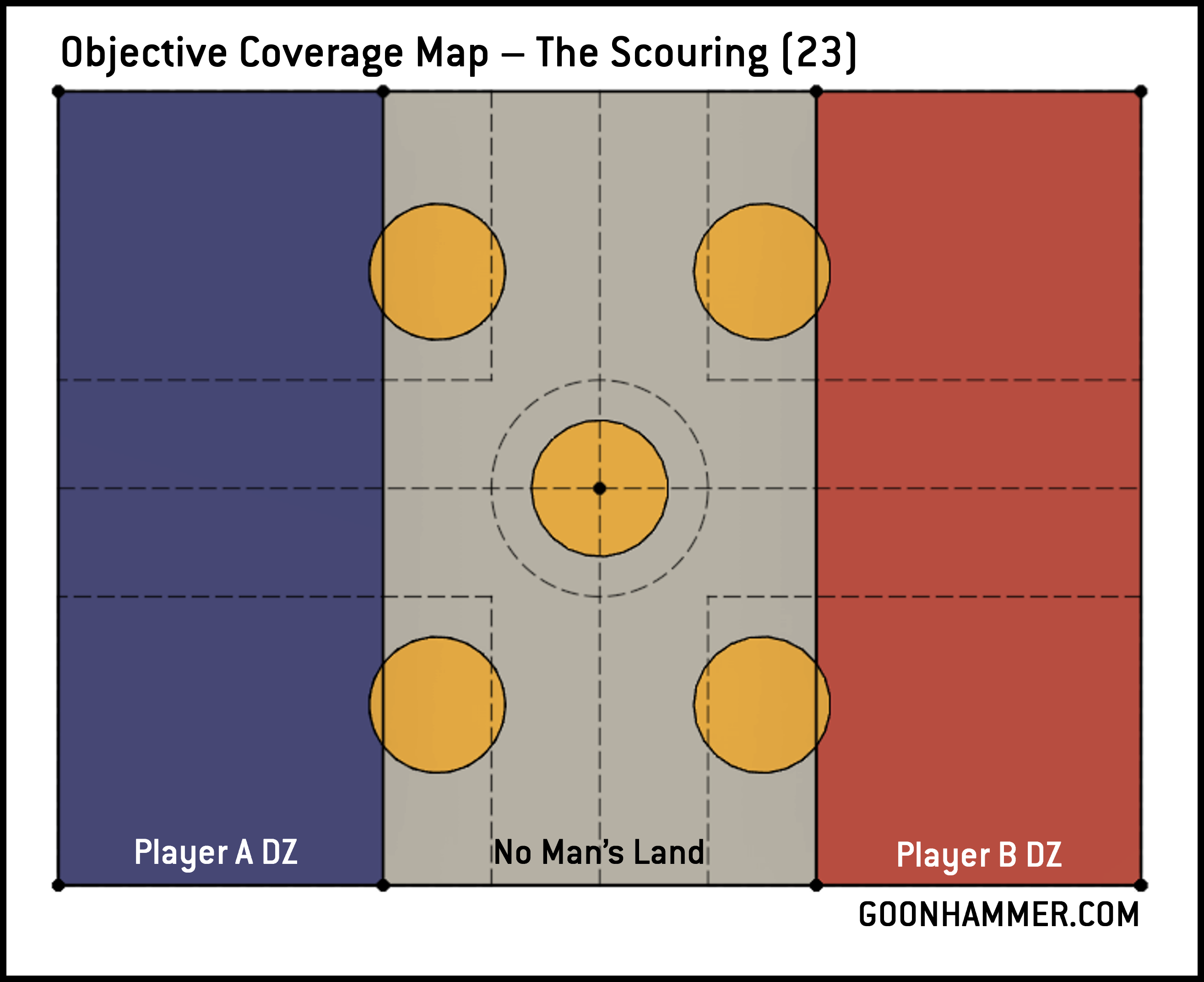 - Every mission but two has a single objective marker in each deployment zone. The Scouring has two markers that have edges in range of contesting each deployment zone, while Secure Missing Artefacts starts with one marker wholly within each deployment zone but can have a second one shift there.