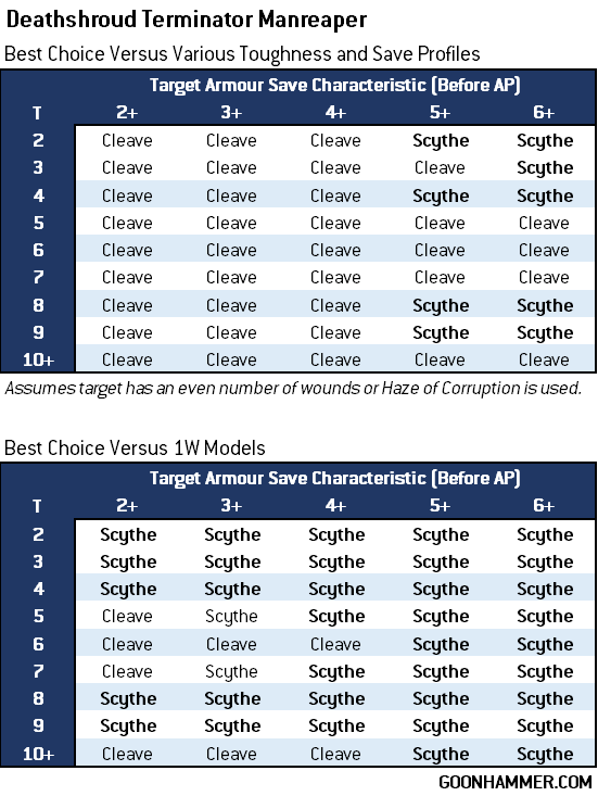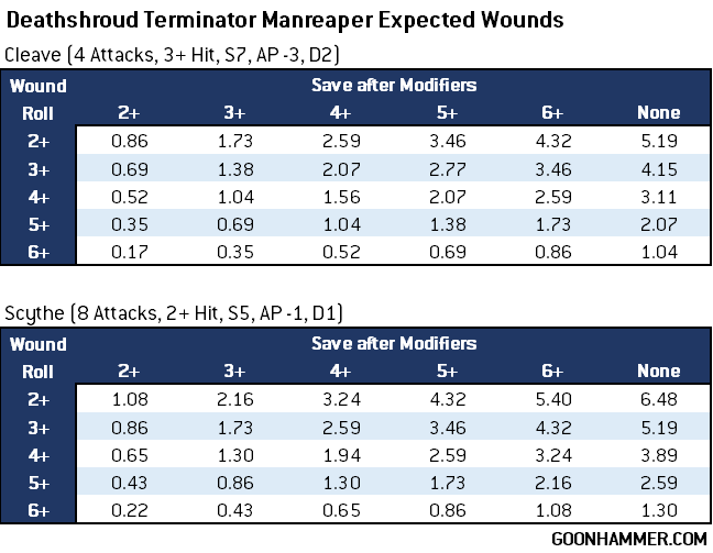 Deathshroud Terminators provide a lethal combination of staying power and offensive ability, and with the new Terminus Est Assault Force they're likely to be even more prevalent. These T5, 3W models with a 2+/4++ invulnerable profile and Disgustingly Resilient for damage reduction are some of the hardest models to kill in Mortarion's Legion. Their manreaper melee weapons provide a nasty melee option with 4 attacks base plus the option to re-roll wound rolls of one thanks to the Plague Weapon ability. Manreapers have two attack profiles to choose from: Cleave hits on a 3+ at S7, AP -3 and a Damage characteristic of 2, but comes with a -1 penalty to the hit roll. Scythe hits on a 2+ at S5, AP -1, and a Damage characteristic of 1 but every attack makes two hit rolls instead of one. Since we're dealing with a large number of possibilities we'll use an expected value approach to determine the best choice. That is, for a given number of attacks, hit, wound, and save probabilities, and Damage characteristic we'll figure out the average amount of damage that will be dealt. While this approach is not perfect and variance plays a major role in determining the outcome, it's a useful starting point. The chart below compares the expected wounds dealt given the final (after modifiers) wound roll and save rolls on the target.So for example, if you were a Deathshroud Terminator fighting a Space Marine Intercessor with Cleave, you'd have four attacks against a target that's Toughness 3 (thanks to being in Contagion Range), giving you a 2+ wound roll and because an intercessor has a 3+ Save and no invulnerable save, they'd have a 6+ Save after modifiers. If instead you took on a Terminator, you'd be looking at a 5+ invulnerable save instead.