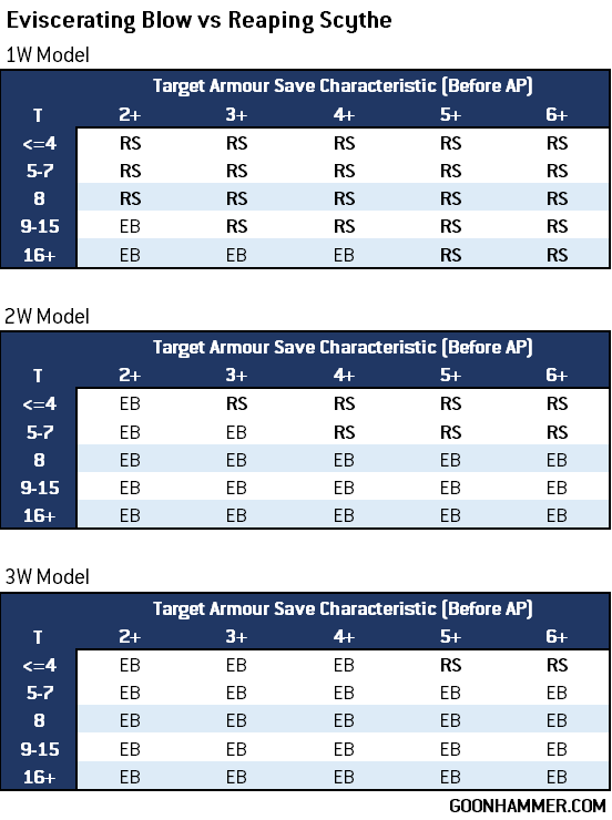 The balance is fairly clear; reaping scythe is superior for clearing chaff while eviscerating blow works as intended against the heavier stuff. Beyond 3W eviscerating blow is the best choice even with the potential for lost wounds; it simply does so much more damage than reaping scythe that there's no comparison. Against Marines and their equivalent reaping scythe is preferable; dealing 21 S8 attacks is an absolutely terrifying threat.