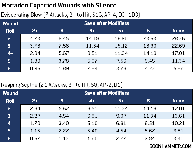 It should be readily apparent that in a vacuum eviscerating blow is by far the superior choice, and it makes sense. 7 attacks averaging 5 damage puts out more wounds than 21 attacks dealing 1 damage. But context is essential, and in this case that context is the potential for lost wounds. 7 eviscerating blows can only kill 7 models, although anything with a Wounds characteristic of 4 or less is guaranteed to die on a hit. 21 reaping scythe attacks can potentially kill 21 1W models, 10 2W models, and it's only at 3W that the two even out. The additional D3 attacks complicates things further against 5W and 6W models; 33% of the time Silence will need two hits to kill a 5W target. So with that in mind what are the best choices against different Wound characteristics?