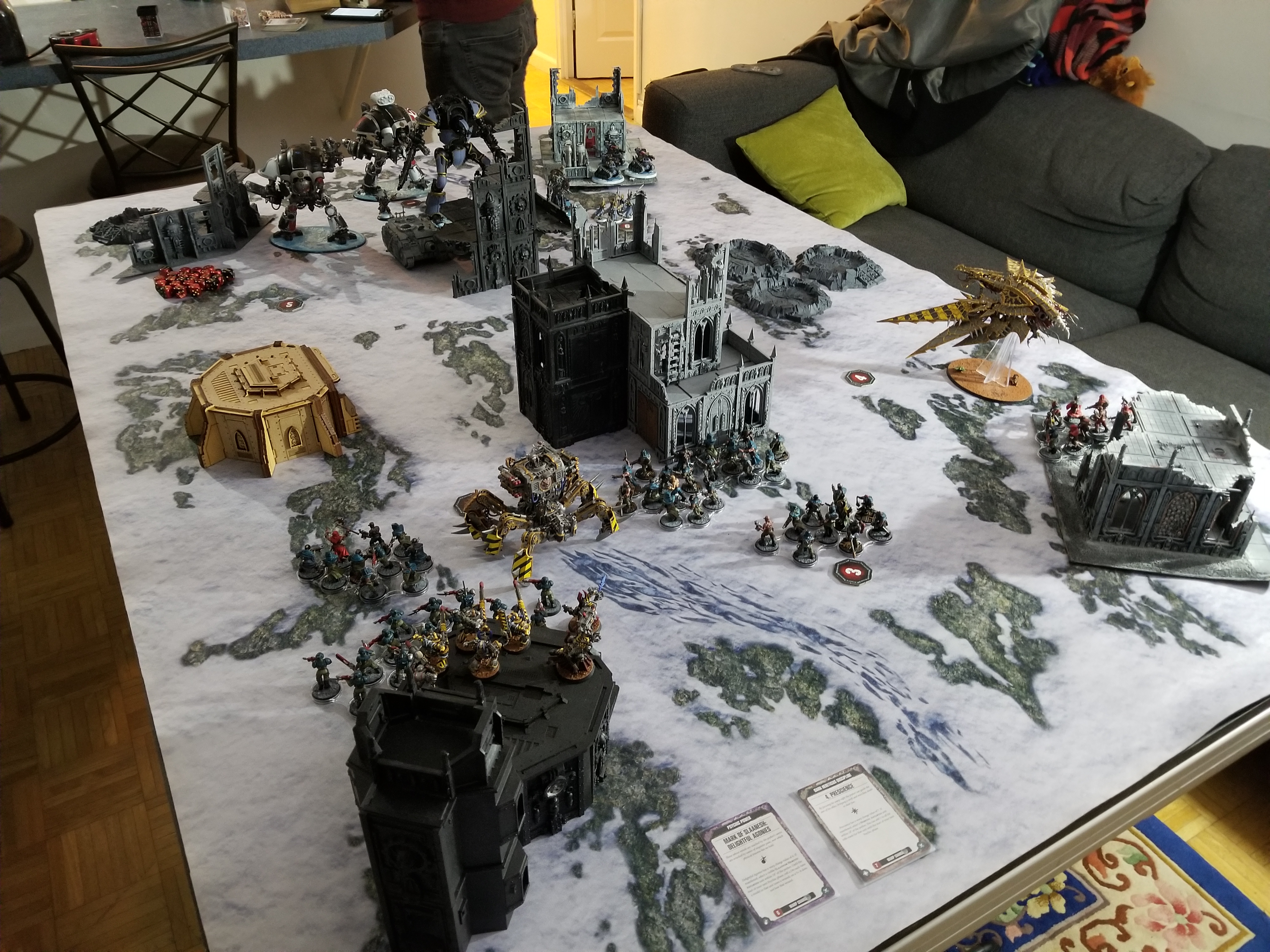 An interesting task to take down a trio of knights, though this is probably not as optimized a list as Eric could bring. It's no cyborg hillbilly yacht club, anyways. The Atropos could be a problem if I can't take it down early enough, and I'm now starting to worry about the amount of anti-knight firepower I have. If I don't get at least average rolls for the Obliterators, that could be a real problem. The mission is 6 objectives with Hammer and Anvil deployment, which isn't great for me. It gives Eric lots of room to hang back with, while my Lords Discordant will have to run to him. Still, I think I can manage this if I can do enough damage with the Discordants. TheChirurgeon's Note: I had to assemble two Lords Discordant for this game really quickly, and they still aren't painted. I'm also behind on my new Obliterators, so please forgive the smaller bases there. I am aware that it is shameful to play with unpainted models, and I apologize.