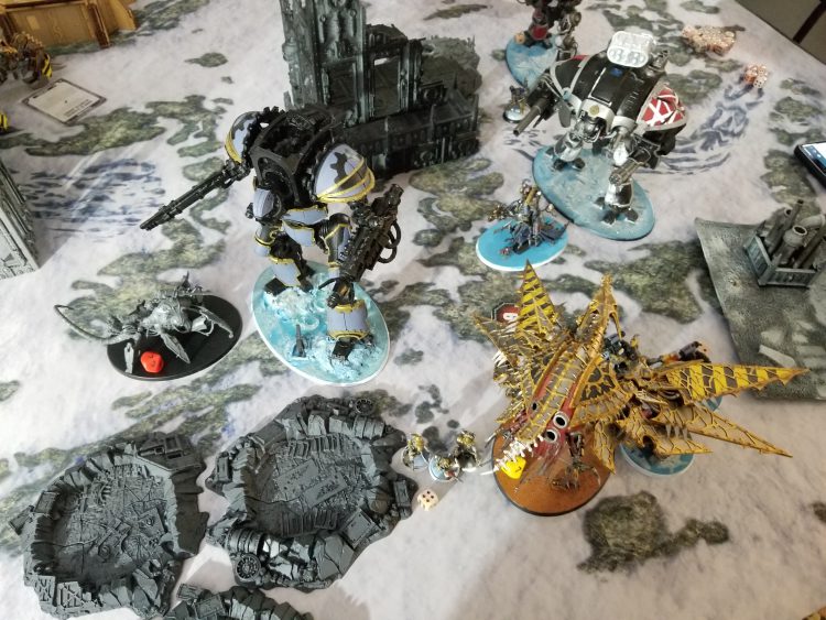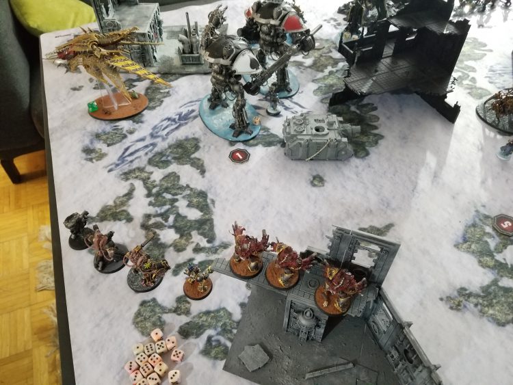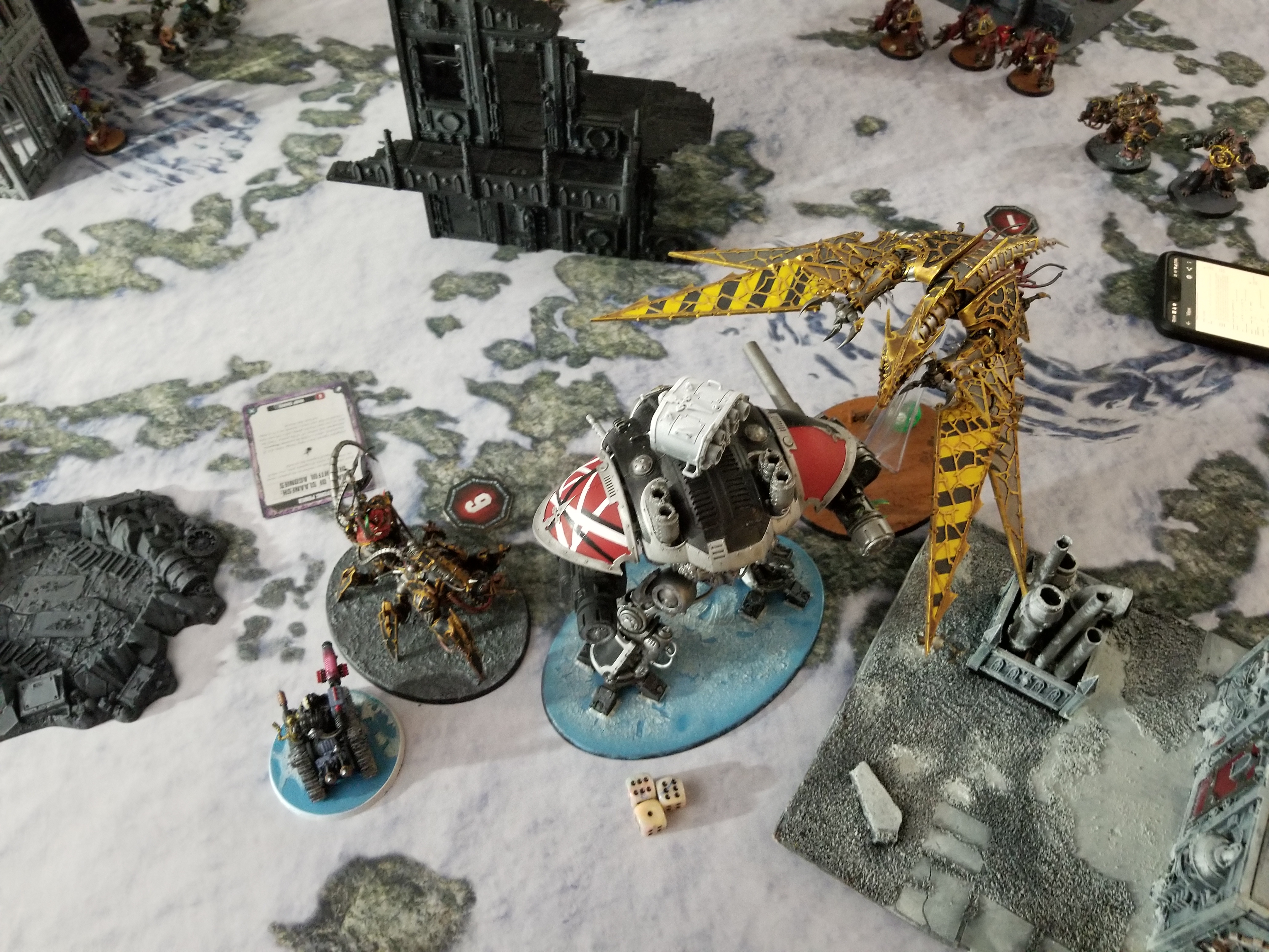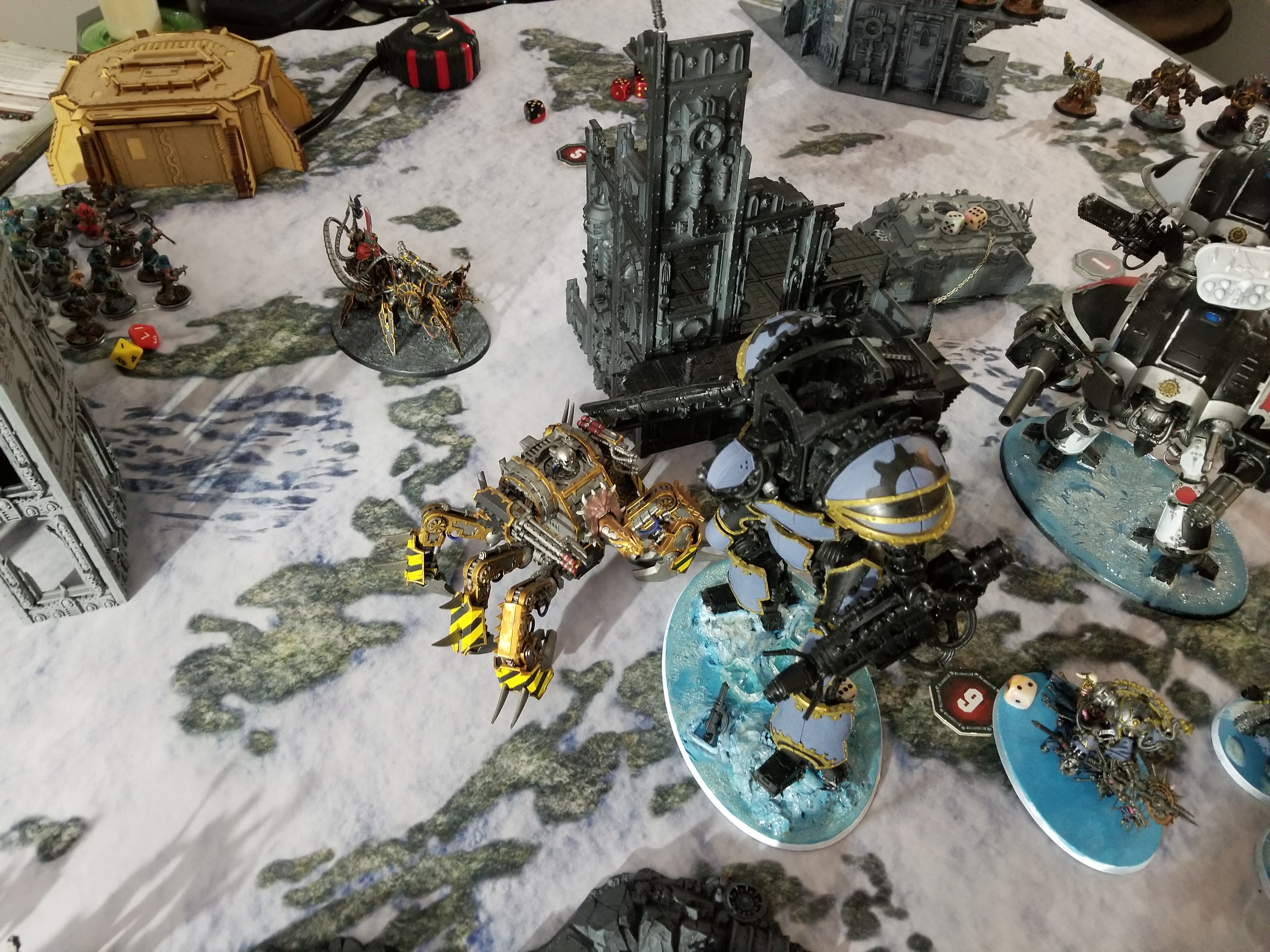 On my turn the pain arrives: the Obliterators and Chaos Lord drop behind enemy lines and open up on the Knight Gallant. They manage to drop it to 10W left after some abysmal rolls shooting twice, which isn't ideal. I also put some wounds on the Disintegrator, dropping it to 4, but I fail all my charge attempts as I'm out of CP. My Defiler manages to charge the Knight Atropos though, and is able to kill it in melee pretty quickly thanks to some S16, AP-3, D6 damage Defiler Claws. I secure kill more and hold more.