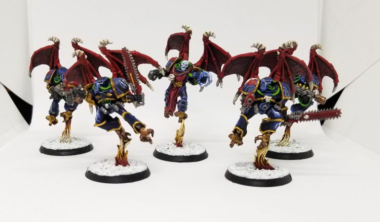 The Raptors come in a max-size squad (15), and have the Mark of Khorne and an Icon of Wrath so they can re-roll charges (on 3D6" thanks to Raptor Strike) and fight twice if I need to. Being a unit of 15 helps maximize their attacks, and with the Night Lords Ld modifier plus the Raptors' inherent -1, they'll almost always have Prey on the Weak active as an option to get an extra +1 to hit. Only being S4 isn't great, but they can use Veterans of the Long War to help shore up the gap against tougher targets. The champion gets to go a little harder with a pair of lightning claws. The plan almost every game is to deep strike these guys and have them charge out of deep strike to clear an objective, or end up in the opponent's deployment zone where they can help score Linebreaker, Engage on All Fronts, or, in a pinch, Deploy Scramblers. Ultimately I chose Raptors over Warp Talons because they're significantly cheaper on a per-model basis and because they can have an Icon of Wrath, helping guarantee that I'll be able to deliver them into combat without spending CP. Warp Talons are real blenders, but they're also just as fragile, and that 5+ invuln is nice but not as nice as having a half dozen more bodies.