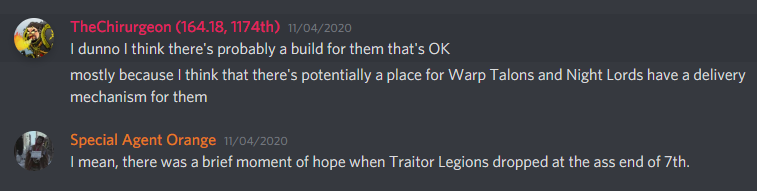Sometimes "Hear Me Outs" are the result of lots of mad tinkering, thinking, tweaking, and twisting. You come up with a weird idea for a list and you just have to test it out and see if it works. Other times, they arise out of a desire to prove someone wrong. Spite, even. This is one of those times, and it starts with a conversation on the Goonhammer Patron Discord. We had just created a Horus Heresy channel in the Discord following some positive feedback for our Night Lords Legion Focus article on Tuesday, when one of our Patrons (thanks, btw) had this to say: