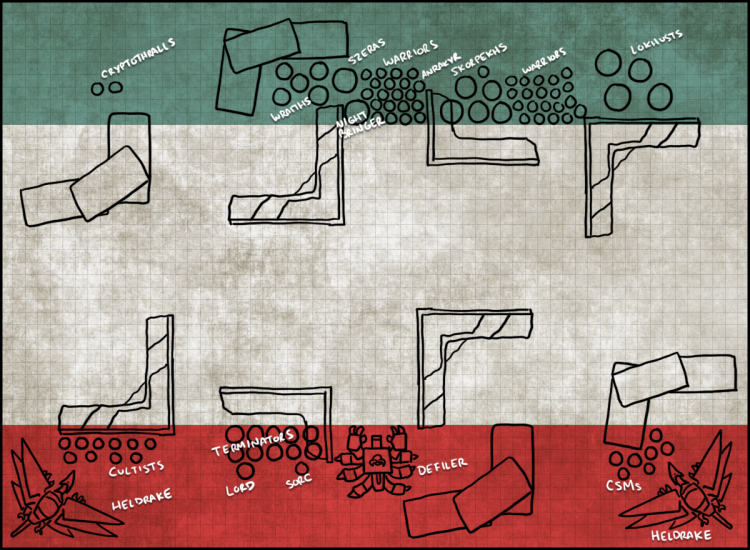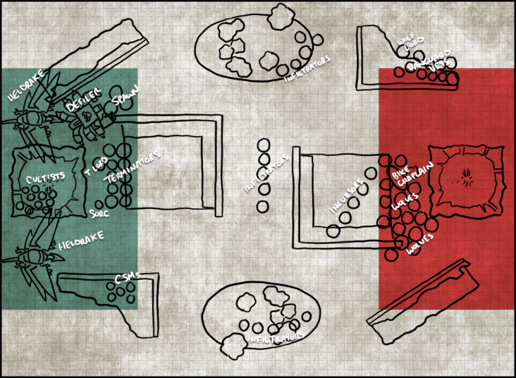 Terrain-wise, this map is basically perfect for what I want to do - there are lots of ruins and no Difficult terrain features, which means the Mutilators can deep strike into buildings and then get the +2 to their rolls charging out of them if I need them as melee combatants. It's also got several choke points coming out of the deployment zone I can use - if I get first turn or Wings doesn't move fast enough, I can use the Heldrakes to bloke those, tying up his warriors and preventing them from moving around, trapping him in his Deployment Zone. This is a double-edged sword, since it'll make it harder to deep strike in there, but the payoff will be that I can control where he goes on the table. This seems like a good plan.
