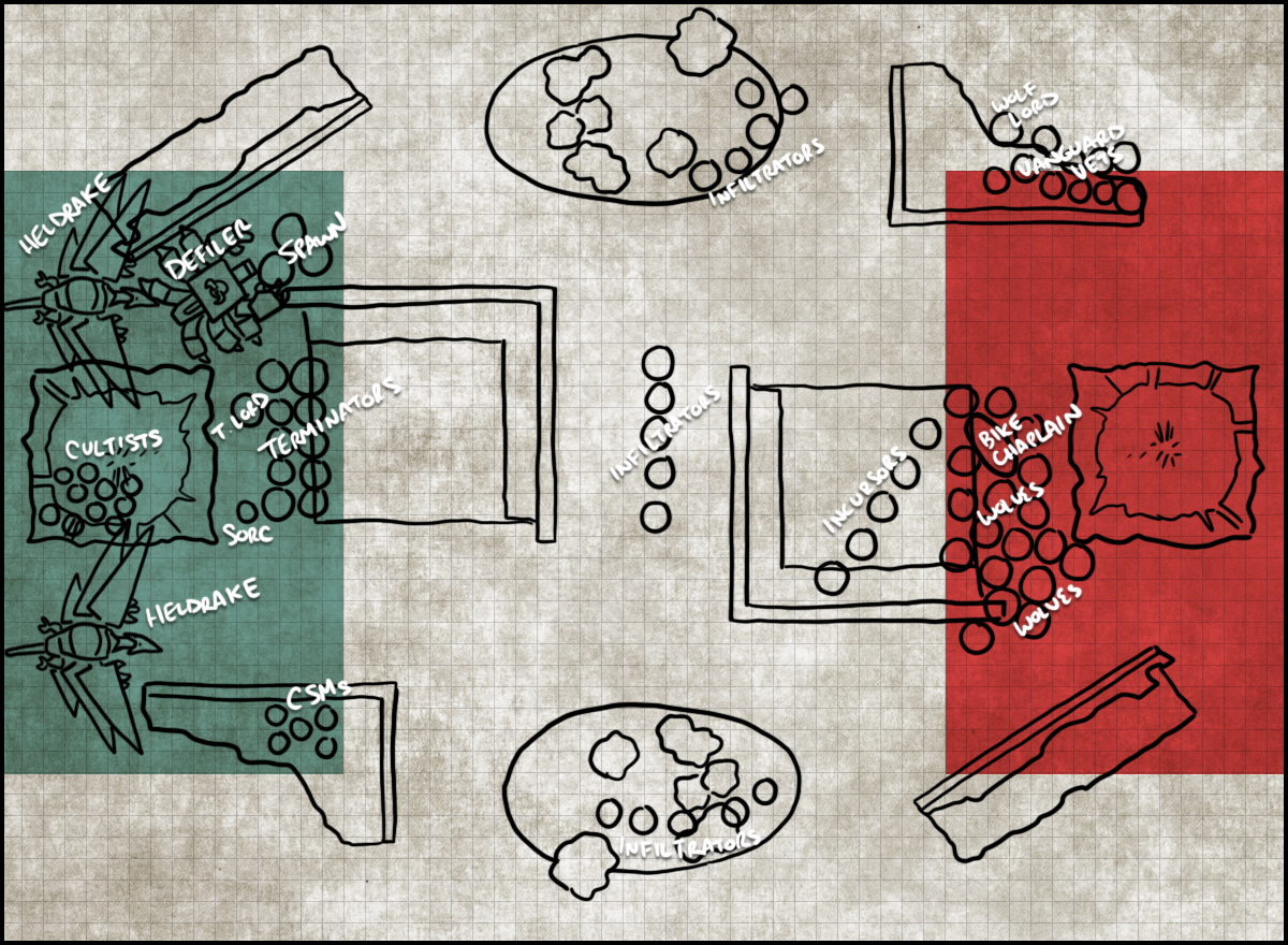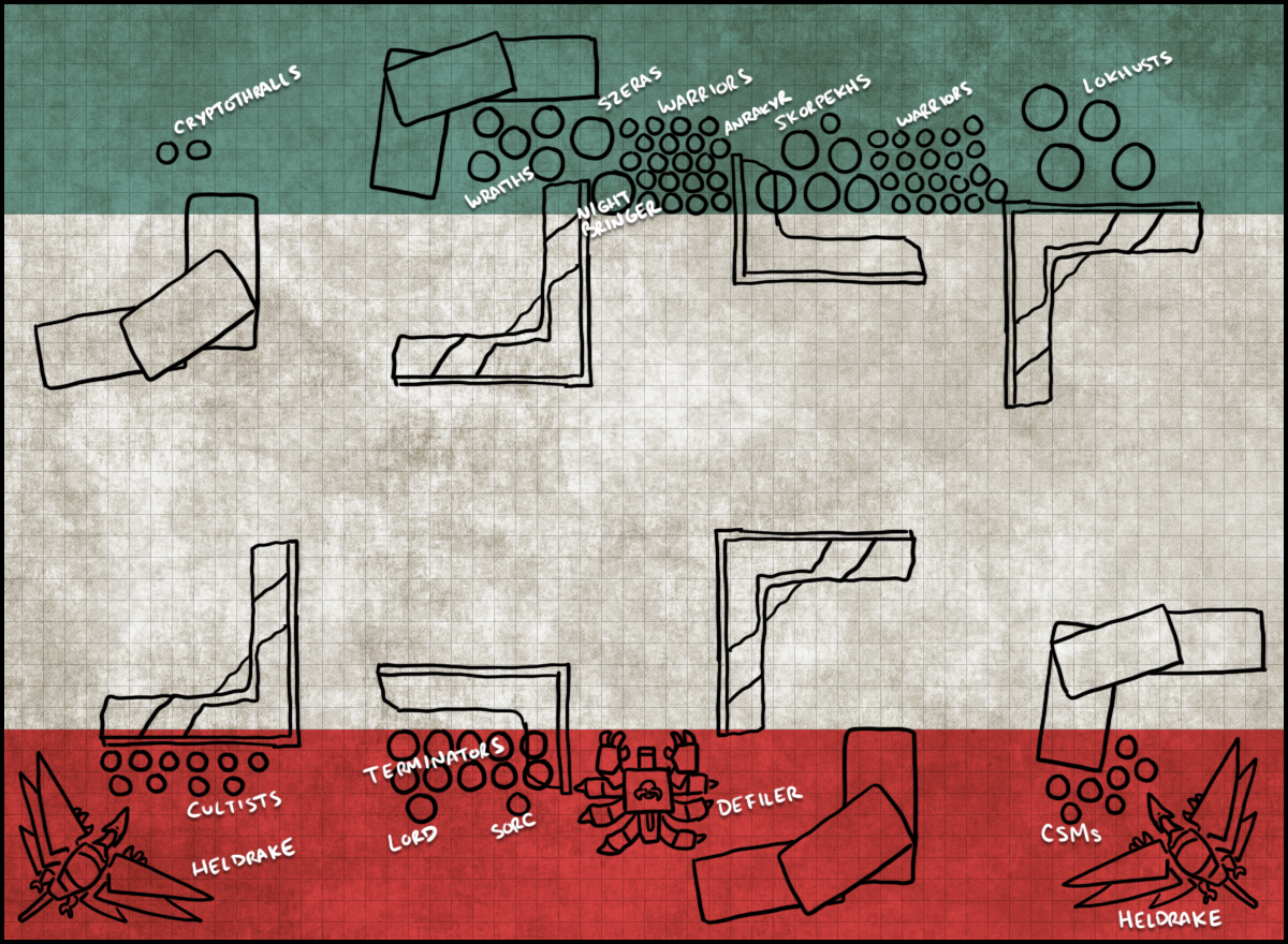 For deployment, I put the Raptors, Haarken, the Mutilators, and the Obliterators in Reserves to teleport in and left the Terminators on the table, planning to have them walk to the midtable objectives. Wings doesn't have anything that can reach me turn 1 if he wins the roll-off but it will mean I'll have to worry about being in charge range and he'll be dictating where my units go. The upside to going up against his melee-heavy list is that on the Nightbringer and the Lokhusts can do real ranged damage, which will mean that my Defiler and Heldrakes are mostly safe if they aren't in melee combat. That'll allow me to be a bit more aggressive with my deployment, though the Heldrakes can be anywhere.