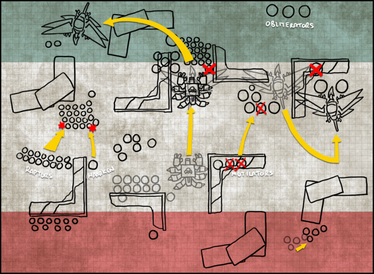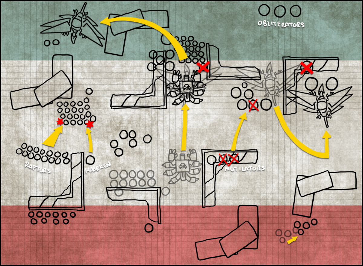 Definitely feels like there's something here - the list has a lot of ways to cause opponents headaches, has strong ways to score points and doesn't give up secondaries easily. It's very much the kind of list 9th Edition's missions have enabled - many opposing armies are going to be able to out-kill it, but it's flexible enough that it can potentially out-score the enemy on the way to that, and benefits hugely from the game being one turn shorter, as otherwise I'd be worried about running out of steam. The only thing I could confidently look at and say I'd want to do differently is that I prefer Warptime to Delightful Agonies - it gives you a vast array of options on the table and helps things like the Defiler keep up with the rest of the army. That's especially true because as we ended up discovering during deployment, the other challenge is that as things stand you have >1000pts of stuff you sometimes want to deep strike, so at least one of your hammer units is foot slogging. I'd consider seeing if the equipment on the Terminators could be dialed back enough (or a model cut) to get things so that they plus the Raptors, Oblits and Mutilators totalled <1000pts. That would force you to deploy Harken on the board, but in general he's going to be able to move to where he needs to be on a key turn.