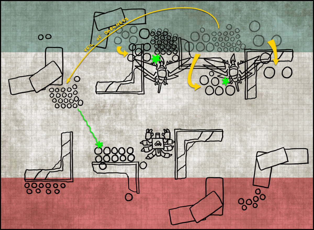 The downside is that both JONK's list and the table we're playing on are bad for me and my gameplan. There are 10 terrain features here and 6 of them have the Difficult Terrain keyword, which means they're awful for landing in and using From the Shadows to charge out of. The list is full of Infiltrators that can deploy forward and box out my deep strikers and if JONK wins the roll-off and goes first, there's a massive chance I just can't recover from losing the roll-off and the primary objective points. The smaller deployment zones also box me in and make it harder to Deploy Scramblers in the opponent's DZ. The upside is that Jon's strategy relies heavily on his Chaplain's multiple Aura litanies, which I can turn off with Vox Scream for a turn or two until they just don't matter any more. JONK won the roll-off, and because he likes to practice playing games where he's behind or something, decided to go second.
