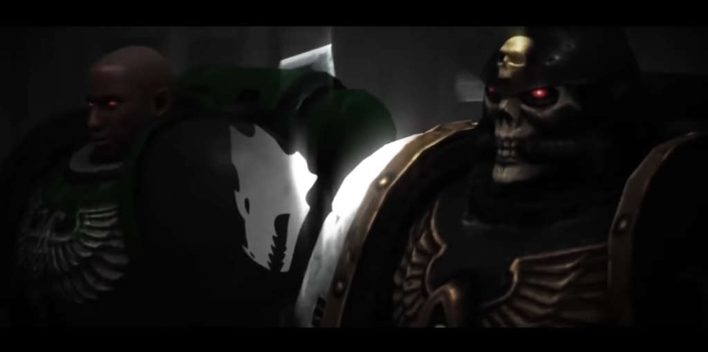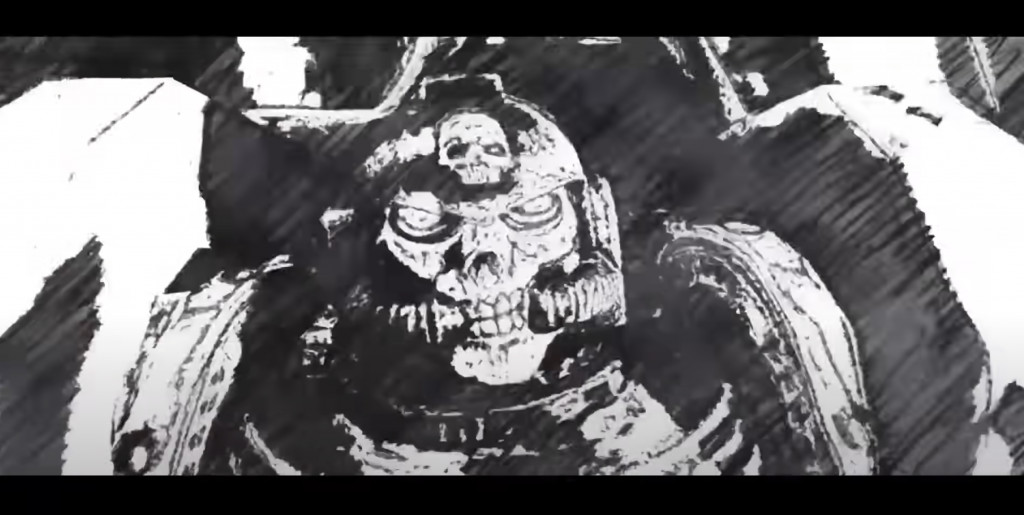 And yet: there’s more evocation in how the husk of Princept Majoris Zarha Mancion is conveyed in the early, crude black and white than the full-color but somewhat wanting light of the work’s technology, fully-realized. As a mostly-untextured haze hidden and contorted by shadows in her tube, she was was less knowable and more abstract, literally as well as figuratively forcing the viewer to fill the character in; by the hour and forty minute mark we simply see too much of her, and she’s a gaunt zombie rendered from hardware generations past. This is part of why the Space Marines are an effective canvas for Boylan’s budget and scope: they keep their helmets on most of the time. The real costs of this sort of animation are in the faces and the hands. Those are best hidden at all times, by death masks and power armor.