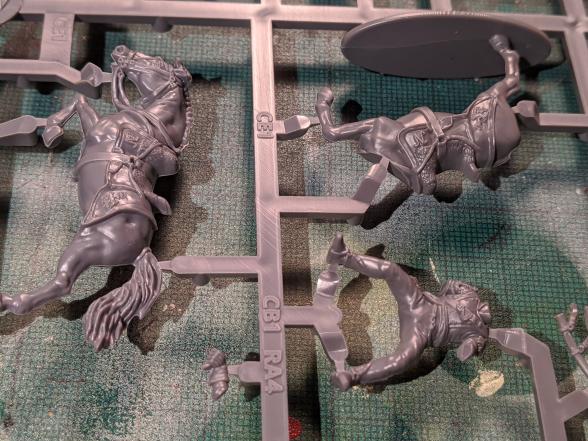 The casts are clean. While they don’t have the sort of sprue design that GW do (I don’t think any plastics manufacturer is within ten years of GWs current design standard) there are few mould lines, and the sprues are logically laid out. You get three cavalry per sprue, and three standard troop sprues and one command sprue in each set.