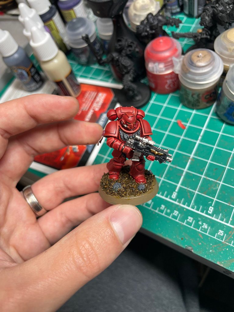 We’re going to go over two different bases here, to show off a few different basing styles. The first will be the Blood Angels Intercessor I painted in the traditional painting article in this series. The second will be a Chaos Space Marine Chaos Lord.