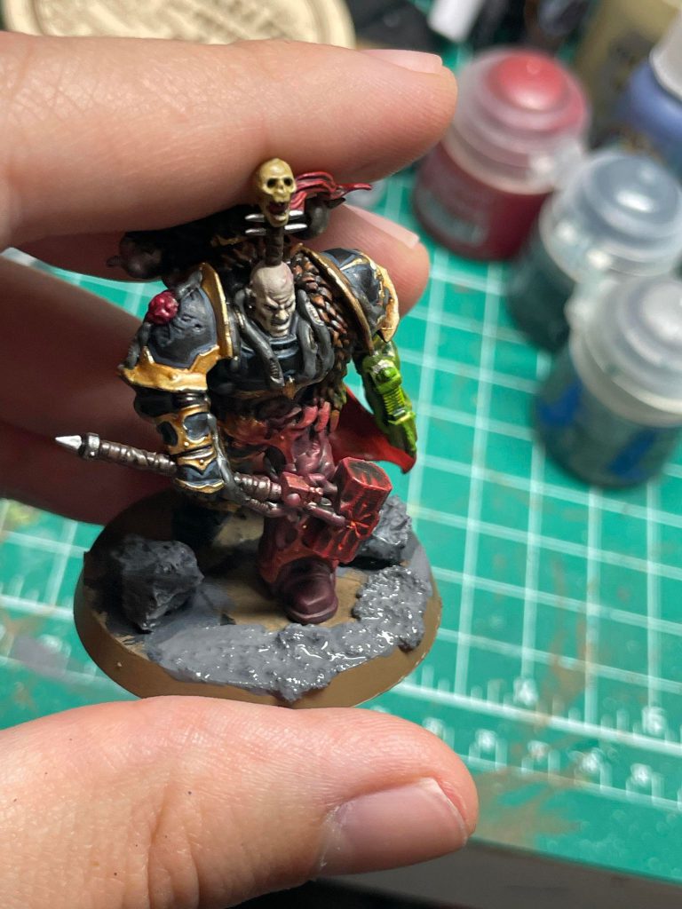 Wouldn't have guessed this guy was evil if it wasn't for his red base! Credit: SwiftbladeJust like last time, we glue on our Battlefield Rocks, prime, and drybrush them, and paint the whole base brown.