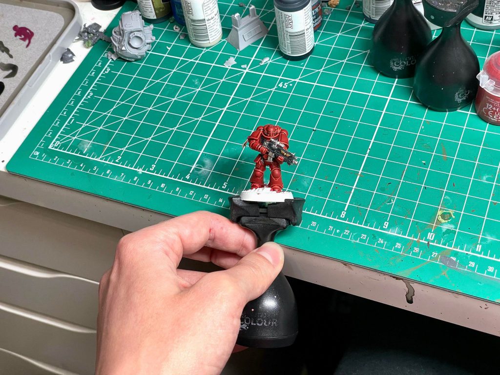 Now that we have our tools all set, let’s get into the basics of miniature painting! For this tutorial, I’m going to paint a Blood Angels Intercessor using the three most basic steps of miniature painting: base, wash, and highlight.