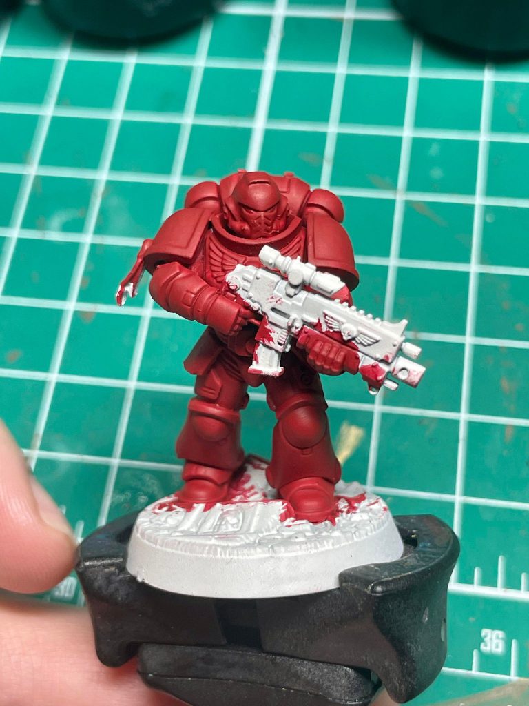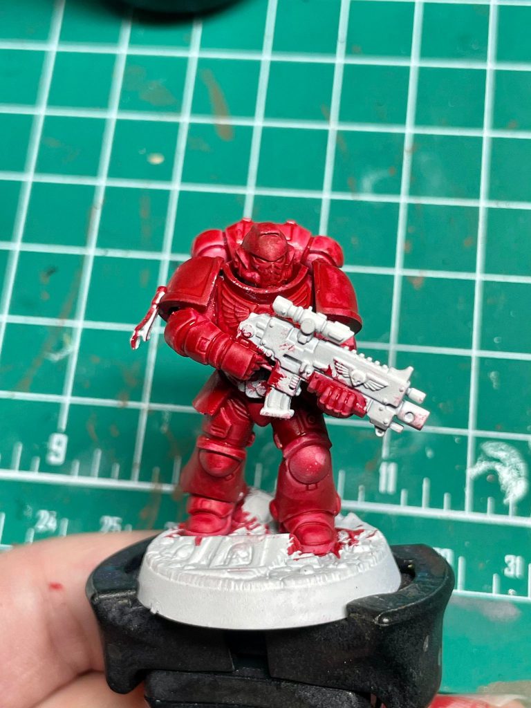 After additional thin coats. Credit: Dan "Swiftblade" RichardsonPerfect, that's a nice even coat of red. Now I’ll apply some black like Army Painter Matte Black (Citadel Abaddon Black) and Army Painter Gun Metal (Citadel Leadbelcher), as well as some other colors for minor details like green on the eyes or the gold insignia on the Bolt Rifle.