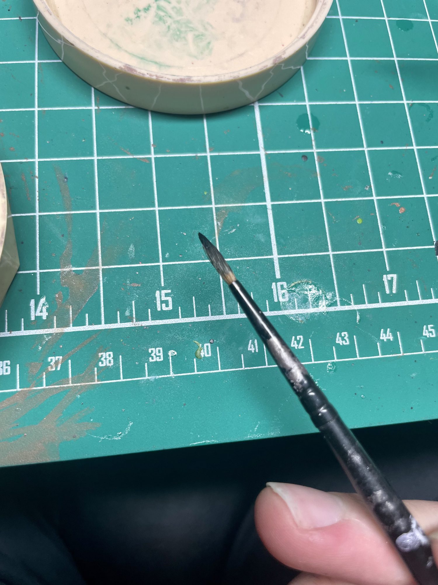 An example of thick paint right from the pot on the left, and thin paint on the right. Credit: Dan "Swiftblade" RichardsonNow to apply the paint. I clean my brush with water and place some paint on the brush, then dab excess water off carefully with the paper towel. I’m careful that I really only want to use the upper part of the brush. If the paint gets too close to the base of my brush, it can seep into the area underneath the handle and damage the condition of the brush. As seen in this picture here, it’s best to work with the top half of your brush to keep it in good condition.
