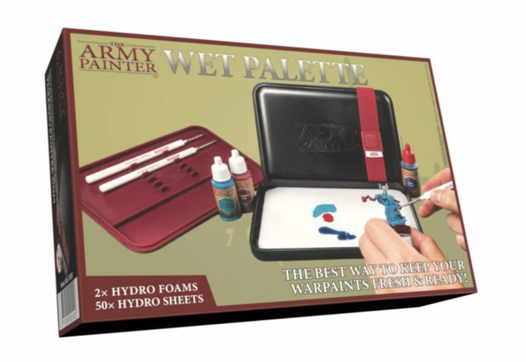 Wet palettes work in a similar way to palette paper. The paper however will be semi permeable to water and sit on a spongey material that is wet. It will also have a case with a lid to hold in moisture. The main idea here is that the wet palette will prolong the drying time of paints, allowing you to use the same drop of paint longer. It also preserves color mixes throughout a painting session. Depending on climate and home conditions, a wet palette can allow the same paint to be used over the span of hours and even up to several days or longer. These require a little maintenance, mostly adding water when it gets too dry. They run in price from about $15 to $30 USD. I replaced my DIY wet palette with this one from Army Painter about a year ago. It comes with a handy tray to hold brushes and enough sheets that I'm still using the ones it came with.