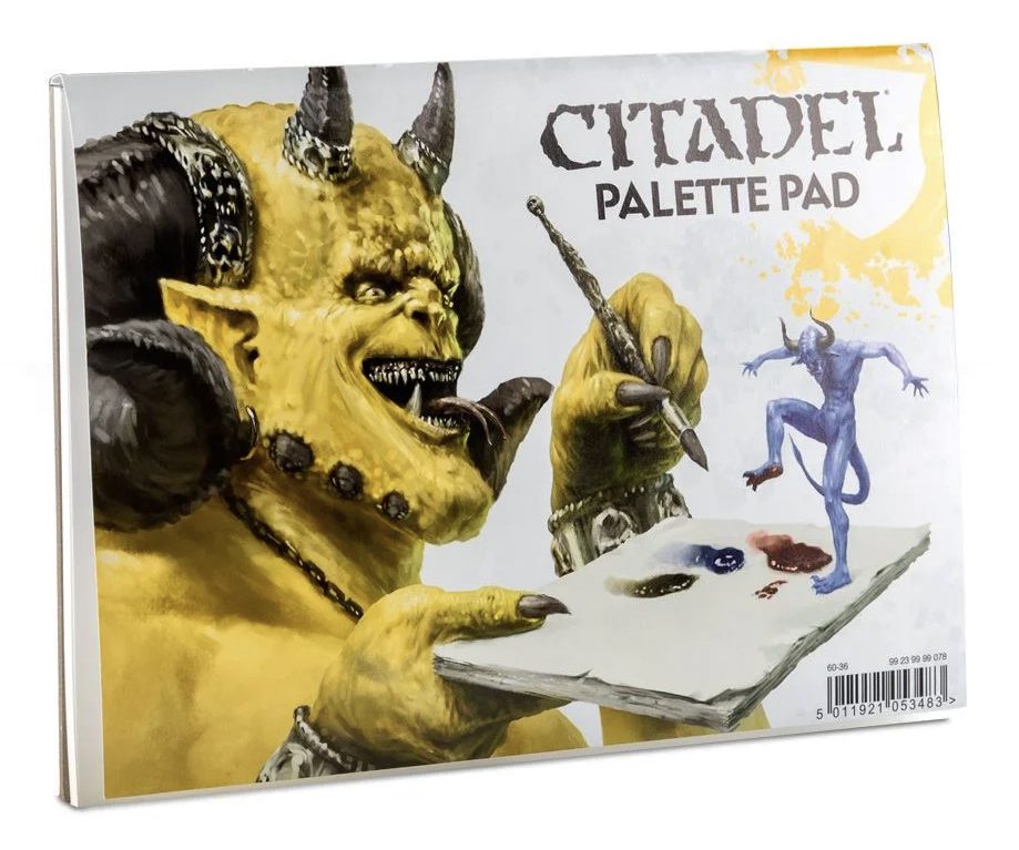 Palette paper is treated with a poly coating to give a smooth surface work on and prevent the paper from deteriorating when exposed to moisture. The Citadel Palette Pad pictured here runs in the $11 to $12 USD range for 20 sheets measuring eight inches by six inches. Most art supply and craft stores also carry various brands of palette paper such as Blick, Strathmore, and Canson. These are typically 40 to 50 sheets of 9x12 paper, for a little lower price than the Citadel option. Palette paper is often advertised as being easy cleanup, just throw it away when you're done. Personally I don't care for one use disposables, but imagine you can get some extended use out of each sheet by letting the paint dry between sessions.