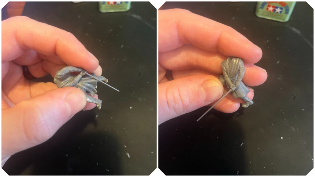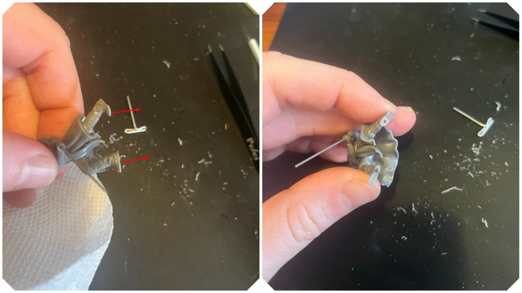 When gluing, make sure the pins are perpendicular to the feet you have drilled. On this miniature, one foot is flat on the ground, and the back foot is on the balls of their feet. I chose to pin both feet, making the back toes a bit trickier. The front foot is drilled into the heel, where you could go deeper due to the ankle/leg connection, but on the other foot, you can only go as far as the top of his boot. Having a little support is better than none.