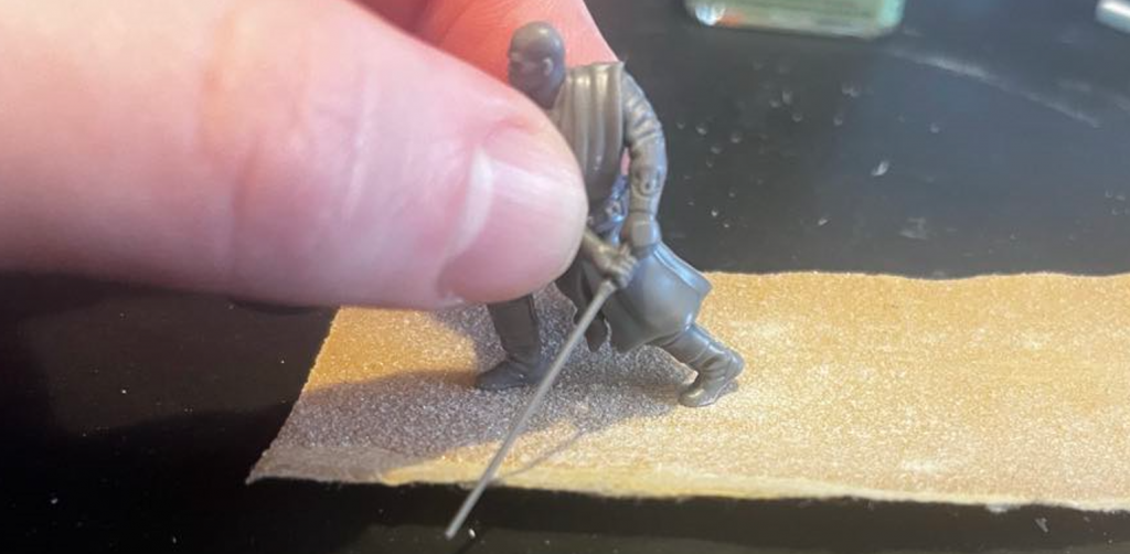 image by Tom ReuhlOnce the miniature is fully assembled, lay down a piece of sandpaper. Then, move the miniature back and forth while holding the sandpaper on the flat surface. You only need to do this briefly until you see some plastic dust. This will create better long-term adhesion and give you an idea of where your pins should be placed.