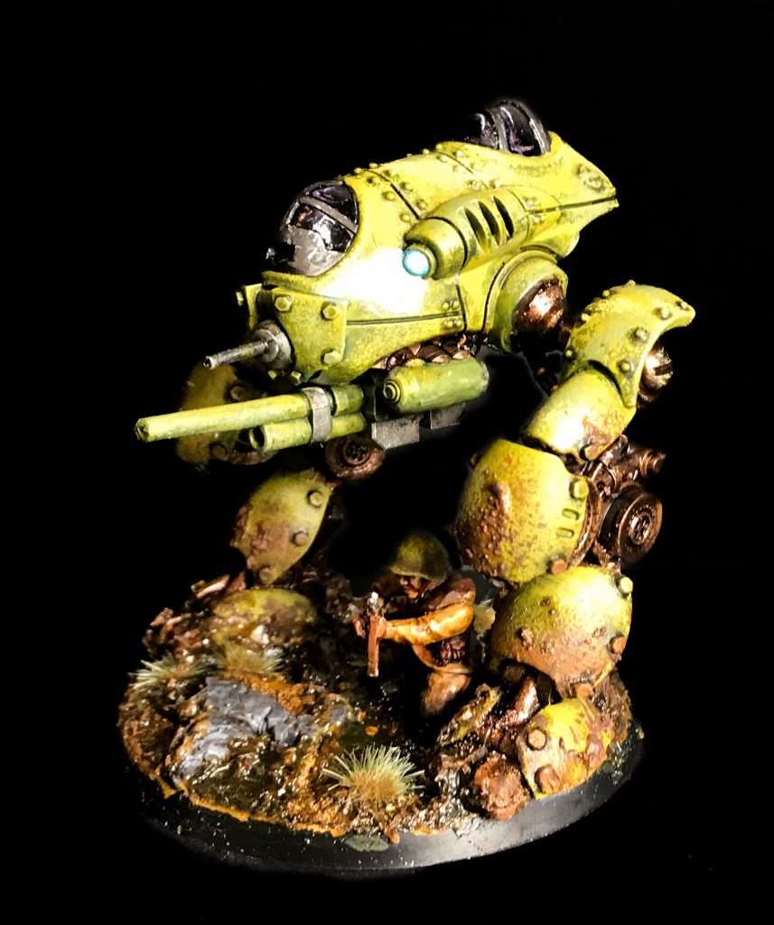 Large bases are a challenge and an opportunity to do something fun and interesting with your models. The techniques for approaching a large base are the same as with any other - think about the framing of the model, apply your tufts, grass, mud and rocks, even think about a giant hero rock (or wood equivalent). It's more important than ever to tie a large model into the base, so think about your weathering, drybrushing and colour placement. It's also an opportunity to have your base affected by your model - use wheels to push tire tracks into milliput, model footprints for walkers and cavalry, or radically change the shape of the base with large built-up areas.There's no single way to do it, so I thought I'd dig up a couple of large base examples to discuss what works about them. They're not even all my own!