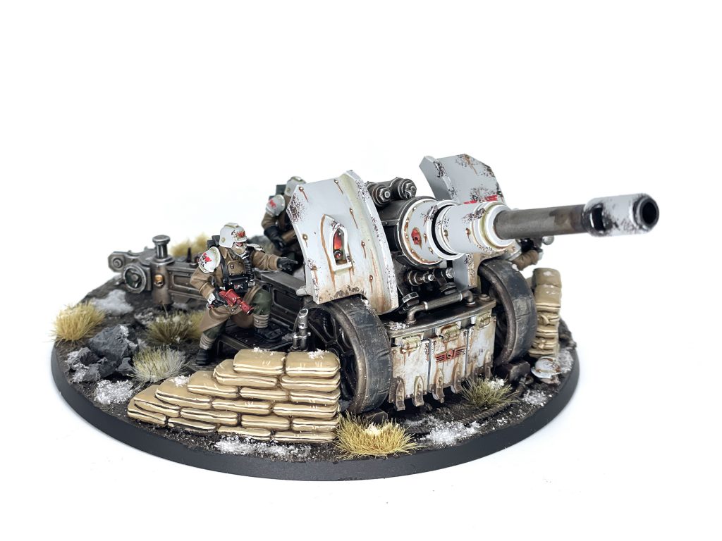 Death Korps of Krieg Artillery Team. Credit: SRMLet's start with SRM's Artillery team. I love this base. Artillery tends to be fun to do - you have the gun, the crew, and a large open space to deal with. SRM has kept it simple with rocks, snow and a variety of tufts, while the model comes with sandbags to form an emplacement. Look at the framing of the sandbags - not directly in front of the gun, and in the bottom third of the model. It's tied nicely together by incorporating some of the basing elements onto the gun carriage with spots of snow and dirt using the same colours as the base. Lovely work, SRM!