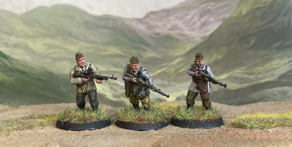 You can see how quick this is on this Bad Squiddo Resistance model - a two second application of the top tone (Warpaints Fanatic Worn Stone) onto shoes and legs connects the model to the base. You're not just perched on top of some soil, but standing on it. Across a whole force this incredibly simple technique makes a huge difference.