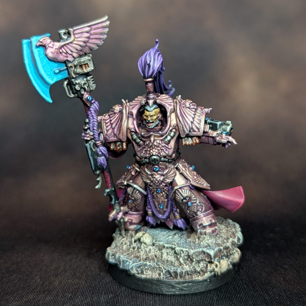 To do it right, think about your model's feet and centre of mass. If both feet are flat, the rock should go underneath both, with the centre of mass aligned over the rough centre of the base and your hero rock. Crab-Stuffed Mushrooms absolutely nailed it with this Allarus Shield Captain: