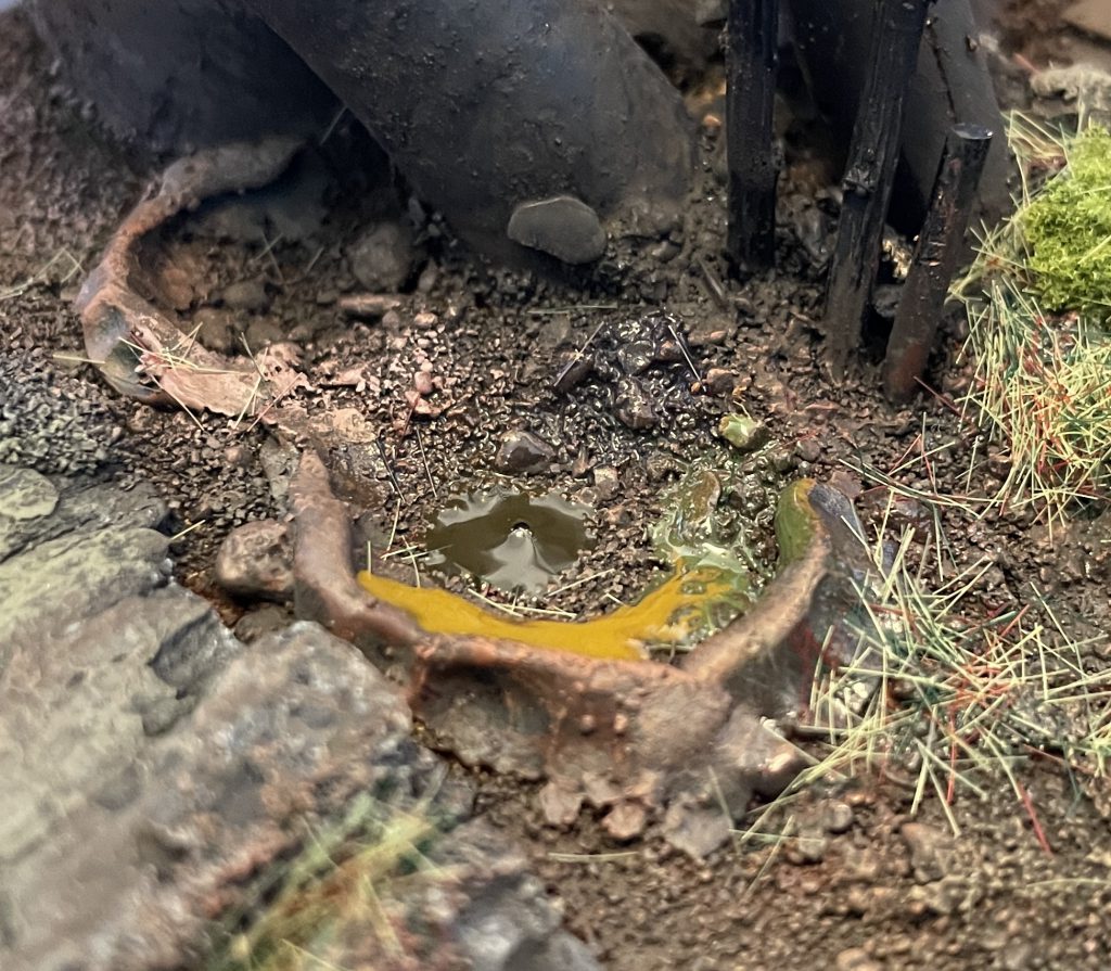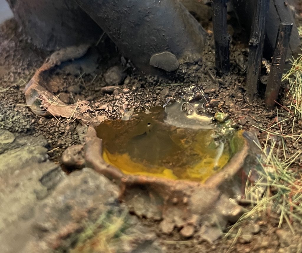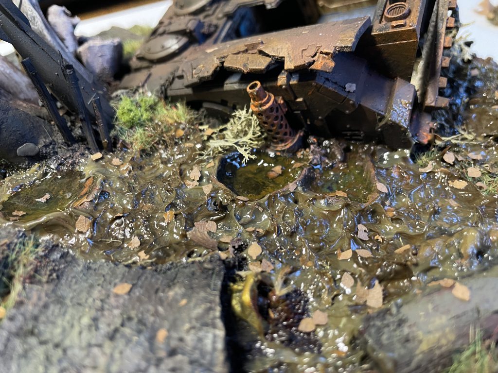 Finished! Advanced basing techniques. Credit: LenoonYou can spice this up further by adding some scattered leaves, bits of static grass or tufts to the puddle or rim. The gloss varnish will soak into them, leaving them looking waterlogged and muddy - ideal!