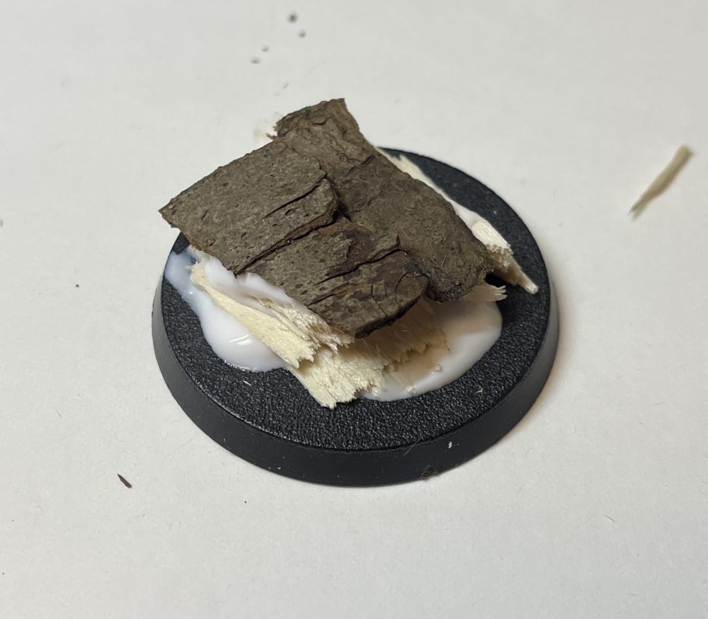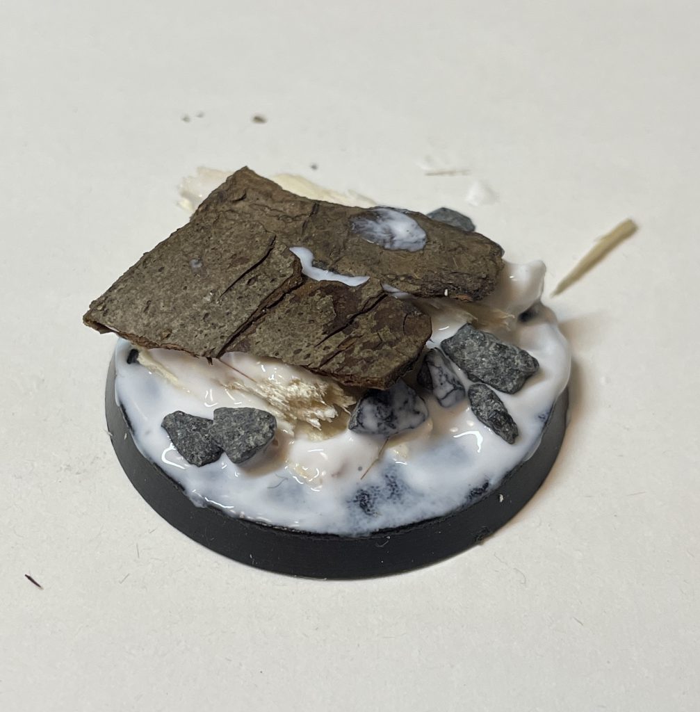 Bark gives a level surface. Advanced basing techniques. Credit: LenoonWhatever you're using, and contrary to GW's model making wisdom, a single rock outcrop on it's own that your model just happens to be standing on tends to look naff. Use some smaller rocks, or chunky basing material (irregular cork fragments, like Army Painter's Battlefield Rocks) around the hero rock to provide a graded transition from hero rock into the base.