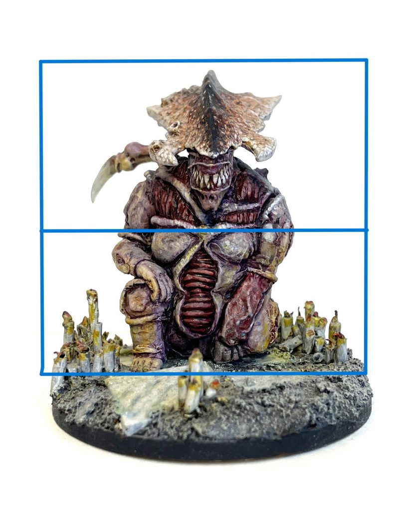 Imagine, if you will, a rectangle around a monster. Advanced basing techniques. Credit: LenoonJack Hunter's Farsight is a good example. The modelled base, with it's on-theme cherryish blossom doesn't reach up and behind the centre of the model. The branches sweep along the bottom and up the right side, adding a frame without drawing focus away from Jack's extremely well done red armour.