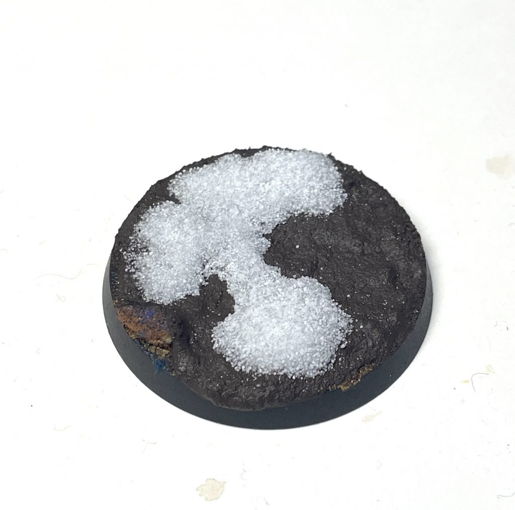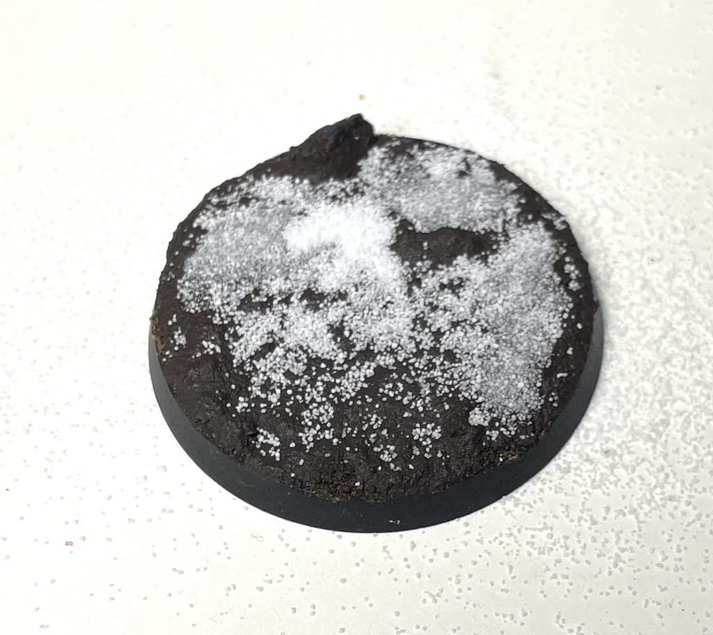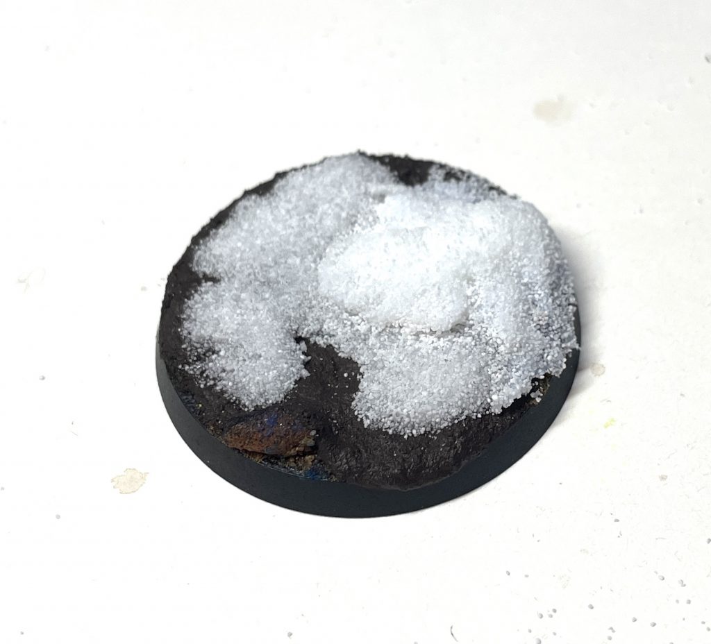 Snow basing Step 1: texture paste or sandSuperglue gives a frosted, semi-transparent look to snow which transforms it into dirty, broken ice. By no means clear, but also far from white, fluffy powder. Simply drop superglue onto the base where you'd like to have an icy crust of snow, then scatter the snow effects on. Multiple layers of this will build up height. Drop more superglue on to finish off without adding more snow and you'll have a nice, obvious, crust on top of your snow effects that sells a thawed-and-refrozen look. If you add superglue then quickly cover the base with a piece of scrap card, the superglue fumes may settle over the rest of the base, giving you a very budget frost look too.