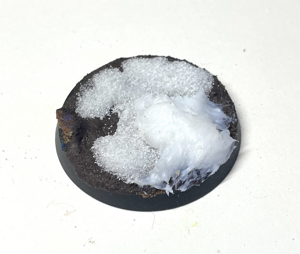Snow basing Step 5: add snow to the glue stick mess!The patterns of different glues doing different things holds across all basing material. Superglue provides very flat, hard, encrusted layers, PVA gives you a little bit of body, and glue sticks (or, I'm told Uhu glue) can be shaped into mounds. Trying different glues with flock and static grass will have different effects - go experiment!