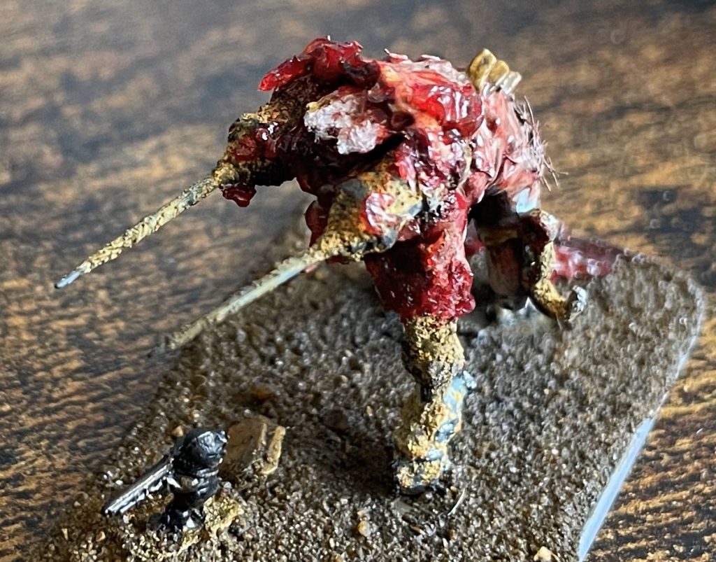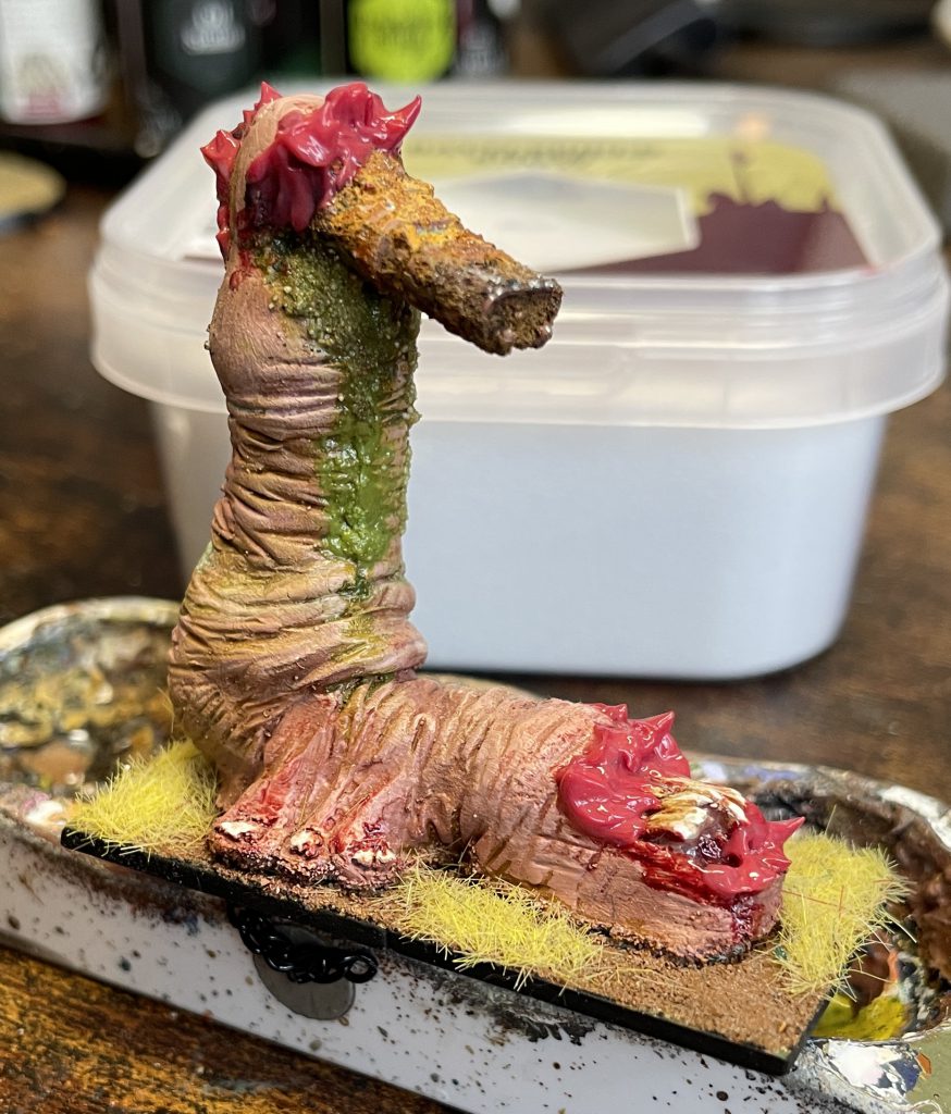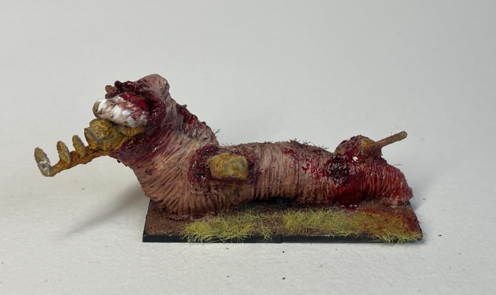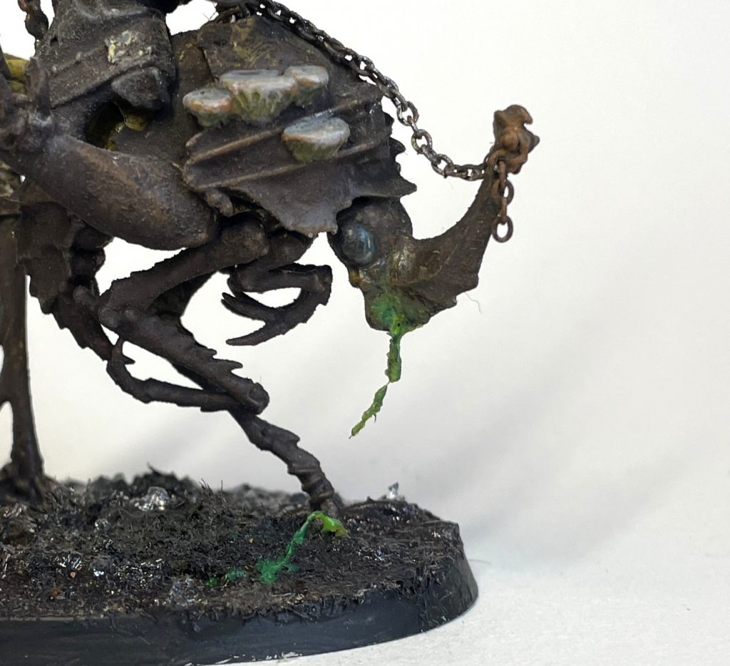There are many, many other ways of doing blood and slime effects. I haven't even started on washes (ok, just thin it out and wash it on), or tricks with varnish and isopropyl alcohol, but until I can practice enough with them to master those ones too (perhaps Hobby 201?), I'll stick to what I know.Ultimately, ridiculous gore and sick aren't painterly effects you should dab on with a tiny brush and take your time over. They're visceral, horrible, textural elements to your paint jobs, so the best advice is to try it out and experiment. Perhaps there's use for corn starch here for thicker but less granular blood, or for using enamel pin washes of black and yellow for streaky vomit, or even worse horrors I can barely imagine. It's a space where you can't really go too wrong, and if you ever think there's such a thing as too much, just watch a non LOTR Peter Jackson film, and be assured that you could go even further!