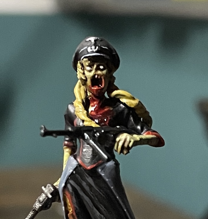 You can, of course, add blood effects with a brush. I find this particularly effective on mouths and other large cavity spaces. This is extremely simple: add Dry Blood first, then a heavy blob of True Blood. Agitate it and swirl it around with a brush or stick, and drag the blobby mess around the model where you'd like it to go. I do this a lot, so here's some examples: