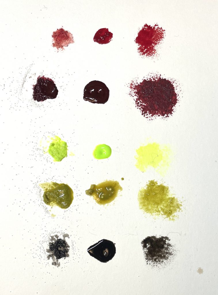 Effects paints tend to act a little differently to standard acrylics, and can mix in some odd ways. As you'll usually be adding blood and gore effects to fully painted models, it's important to get things right straight away. You don't want to have to strip a perfectly good model because the blood effect has accidentally mixed with the vomit into a reasonable facsimile of human waste. Knowing how each paint you're using interacts with everything else is a key step to getting controlled blood and gore effects above and beyond just sponging them on (which is also a good option!). To do this, I make swatches of each effect paint on white and black to test coverage and tone, and each effect paint with the thickening agents. That ends up looking something like this: