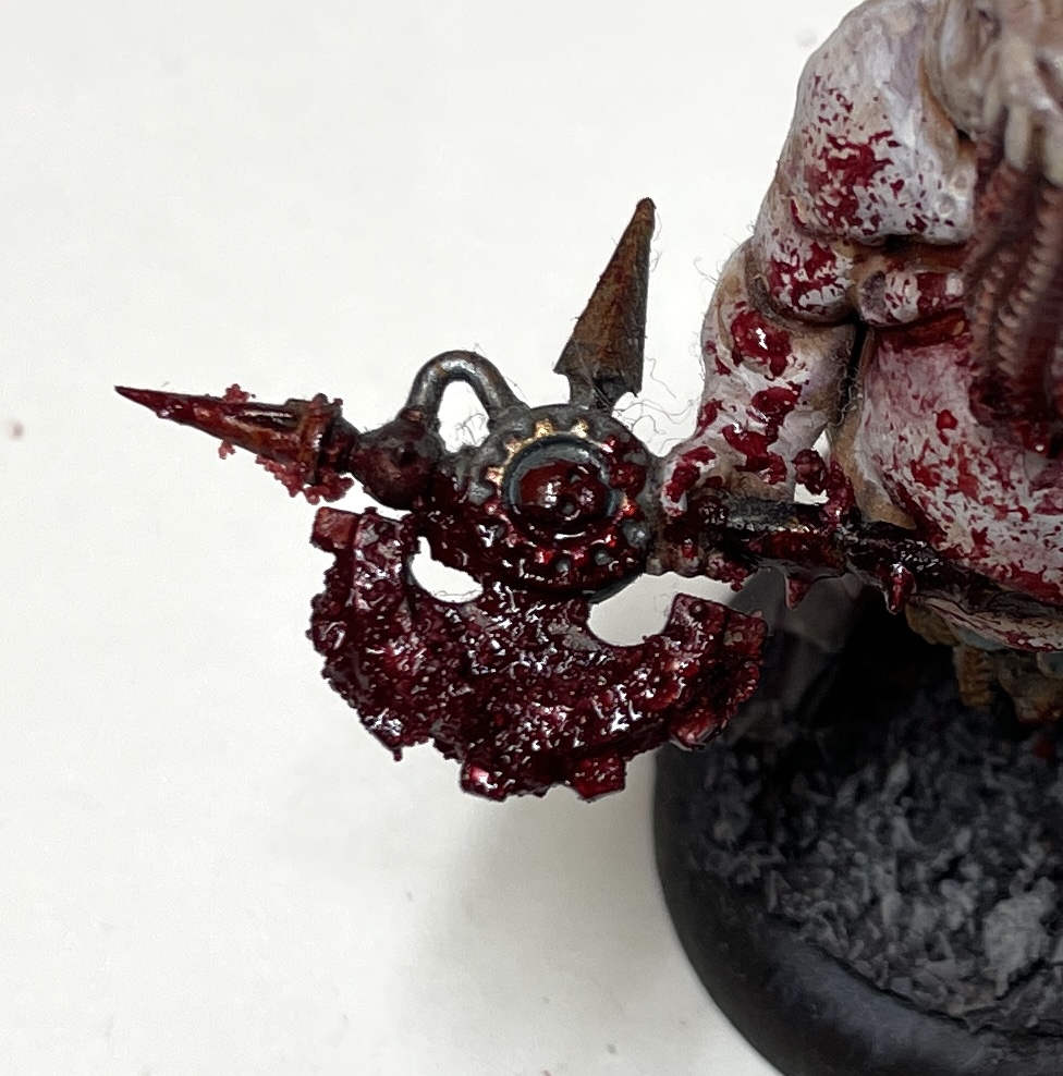 Genestealer Locus Blood and Gore EffectsThe absolute easiest way to do this is to just hit your model with a True Blood caked sponge, focusing on the areas around the axe.
