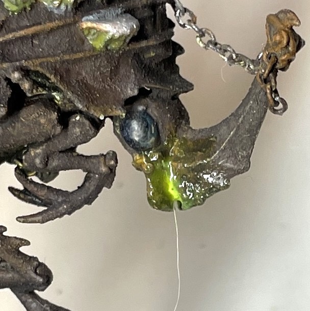 There are a couple of ways of doing stringy slime that I find useful and quicker than the traditional Uhu/Hot Glue gun approach (because I don't own either).For an incredibly quick approach, stick a hair - I use cat, because as you've no doubt noticed, it is all over the place in my hobby space - into the mouth or other area you'd like the string to fall from. Make sure the mouth is nice and gooey looking already, with a high gloss finish. You want that high gloss for the next step.