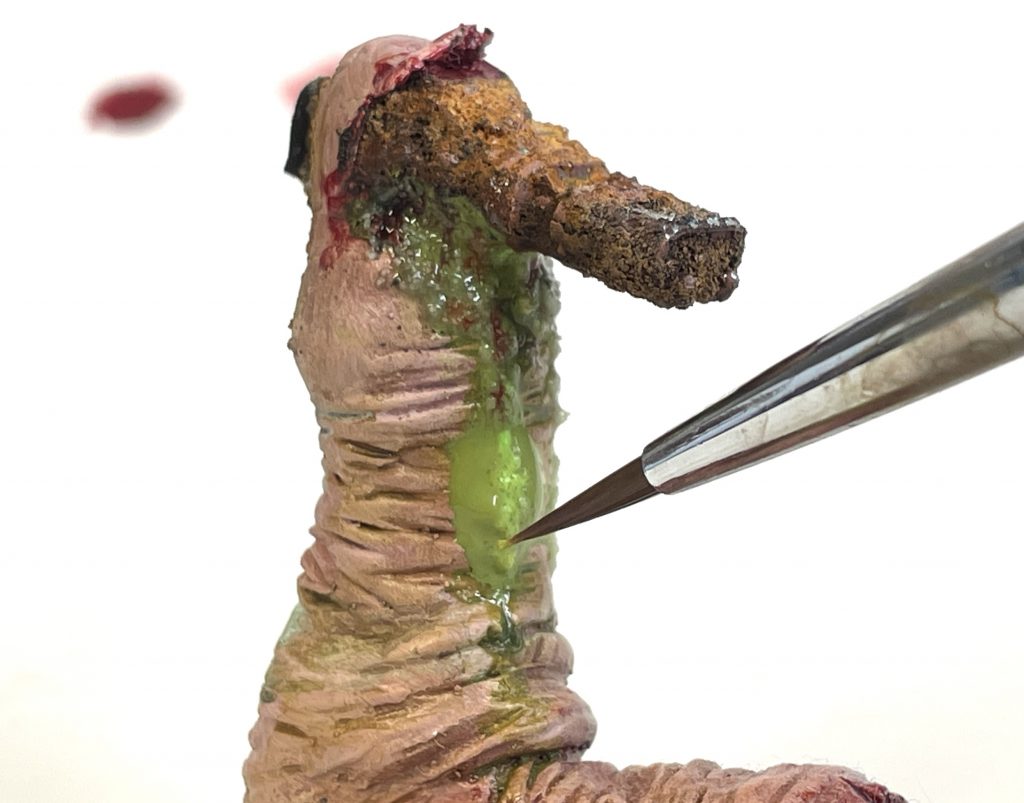 Blood and Gore EffectsYou can push this further with the tiniest bit of highlighting, while everything is still wet. This is just a little off white very carefully dabbed on with a fine brush. It'll mix ever so slightly on its own, so you can just dot it on: