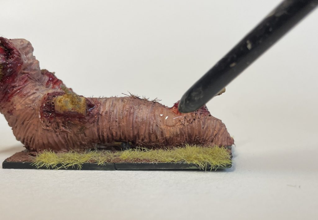 No matter what you can do with Snow and PVA, Really bloody/vomity effects are best served with water effects. This is a very simple process.Scoop out the water effects, mix them with Dark Blood, and slather them onto your model. Aim for quite an opaque look, as the water effects will dry clear: